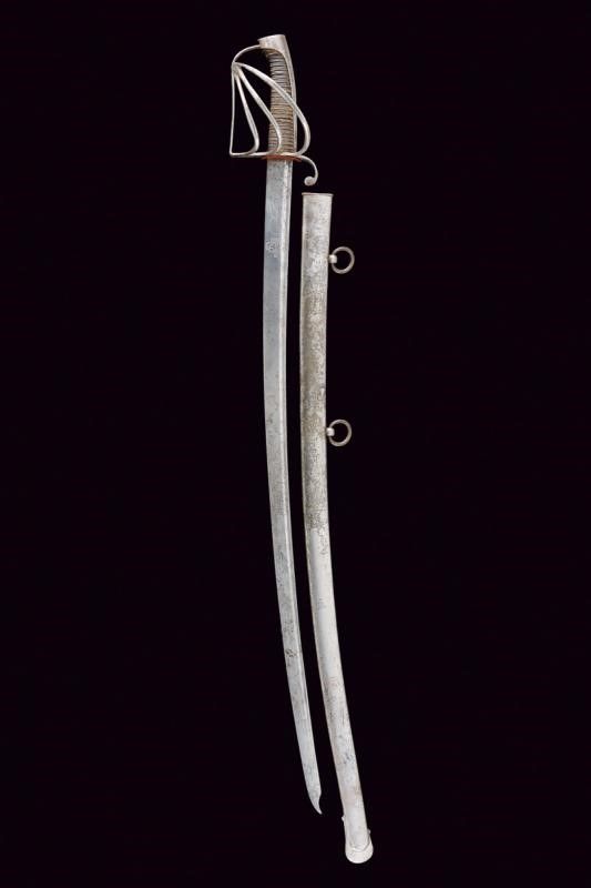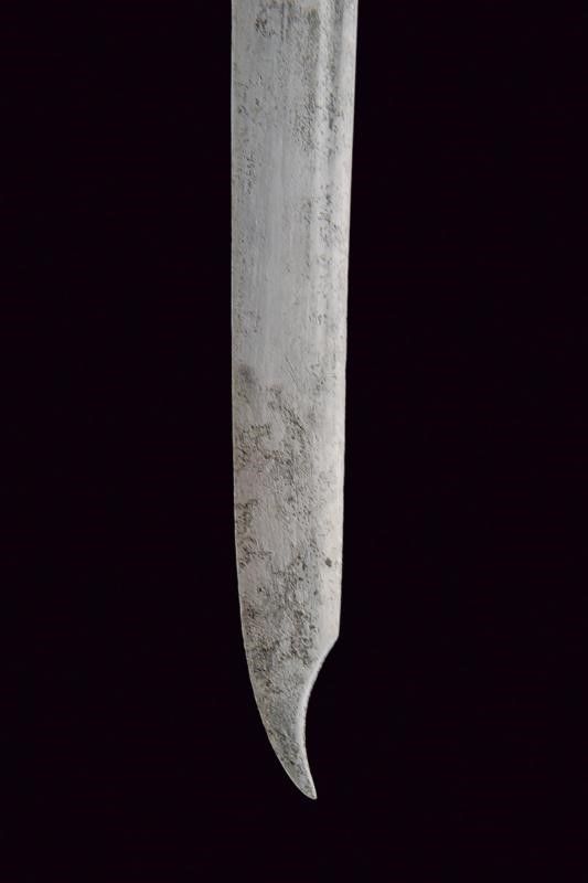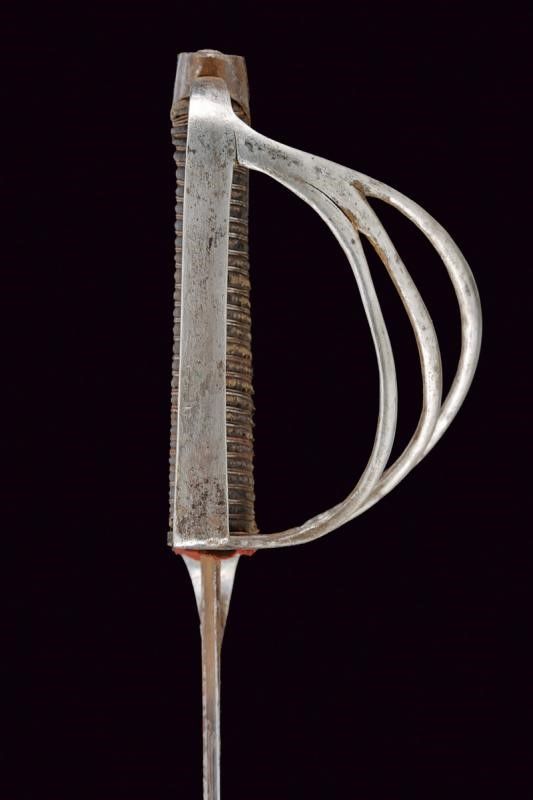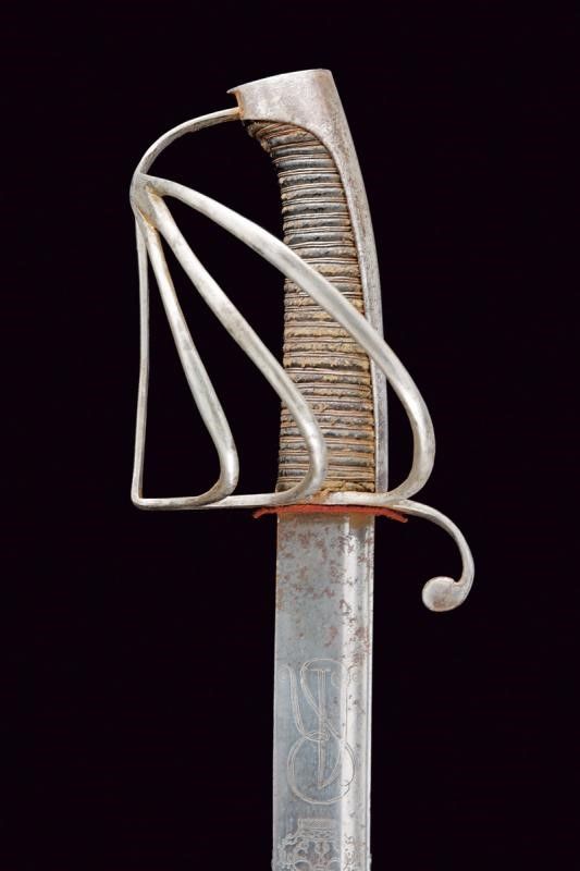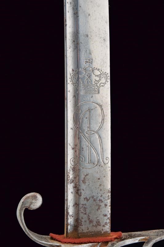 datazione: Seconda metà del XVIII secolo provenienza: Polonia, Lama leggermente curva, a un filo e controfilo, con scanalatura dorsale e punta incavata. La base con monogramma reale 'SA' sotto corona per re Stanislao II Augusto su entrambi i lati. Fornimento in ferro con braccio di parata incurvato verso la lama e con ricciolo all'estremità. Quattro rami di guardia, cappetta lunga e liscia, piatta e appuntita al dorso. Impugnatura in legno, rivestita di cuoio con trecciola metallica. Completa di fodero in ferro a due anelli di sospensione. lunghezza 96 cm.