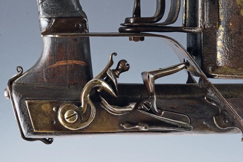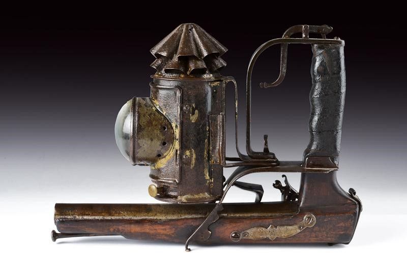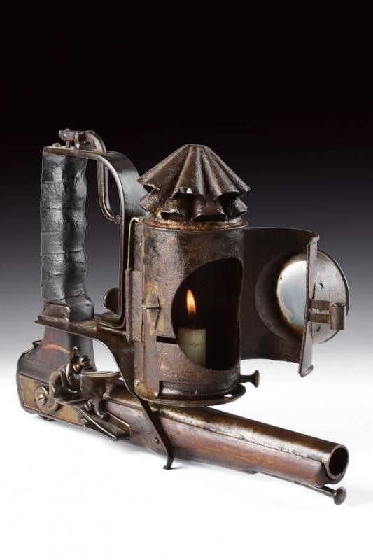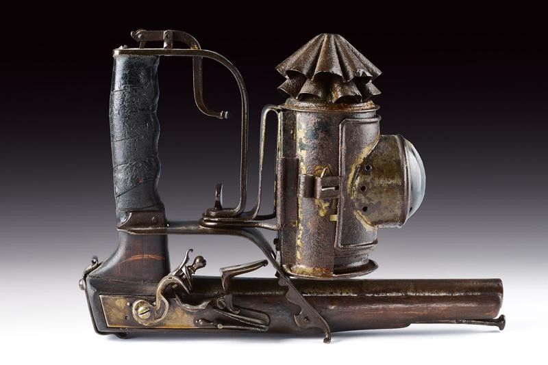datazione: Inizio del XIX Secolo provenienza: Italia, Canna tonda liscia, cal. 17 mm. Batteria a pietra focaia, cassa in legno con bacchetta in ferro. Sopra alla batteria l'impugnatura, posta perpendicolarmente sull'arma, munita di guardia e grilletto in ferro; anteriormente all'impugnatura è montata una lampada in ferro con portacandela e lente, munita di schermo apribile e doppia copertura. Meccanica della pistola funzionante. lunghezza 30,5 cm.