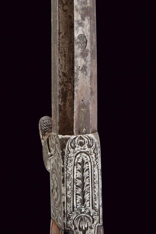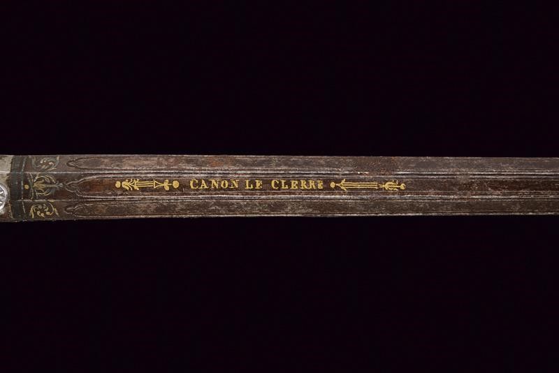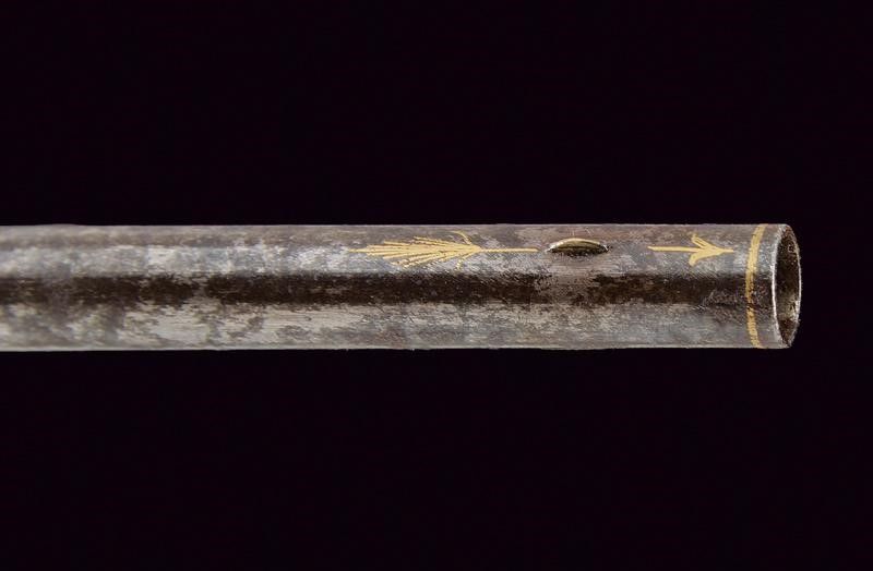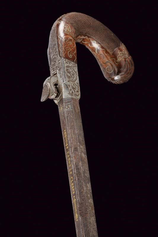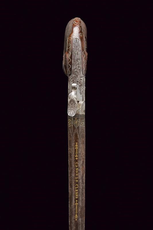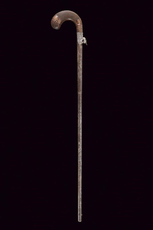datazione: Metà del XIX Secolo provenienza: Francia, Canna-fusto liscia, in ferro, a due ordini, ottagonale e tonda con anellature al cambio, cal. 11 mm. La volata delineata in oro e con incisione a freccia dorata alla base del mirino. Alla culatta resti di racemi dorati seguiti da tre cartigli incavati al bordo, quello centrale con la firma in oro 'CANON LE CLERRE'. Nella parte inferiore della canna il timbro del banco di prova di St. Etienne e punzone 'S'. Meccanica boxlock con castello in ferro inciso a racemi. Il meccanismo ben funzionante, a due scatti; il grilletto a scomparsa. Impugnatura a 'C' in legno, zigrinata e intagliata a conchiglia al pomo. Arricchita con agemine in metallo color argento a volute e puntini. Probabilmente in origine il bastone aveva anche un piede rimovibile da inserire in volata. Rara commistione di una pistola Boxlock e un bastone-fucile. lunghezza 79 cm.