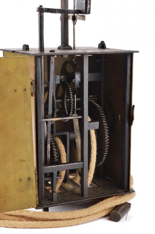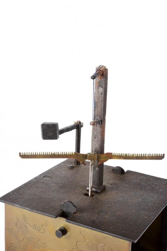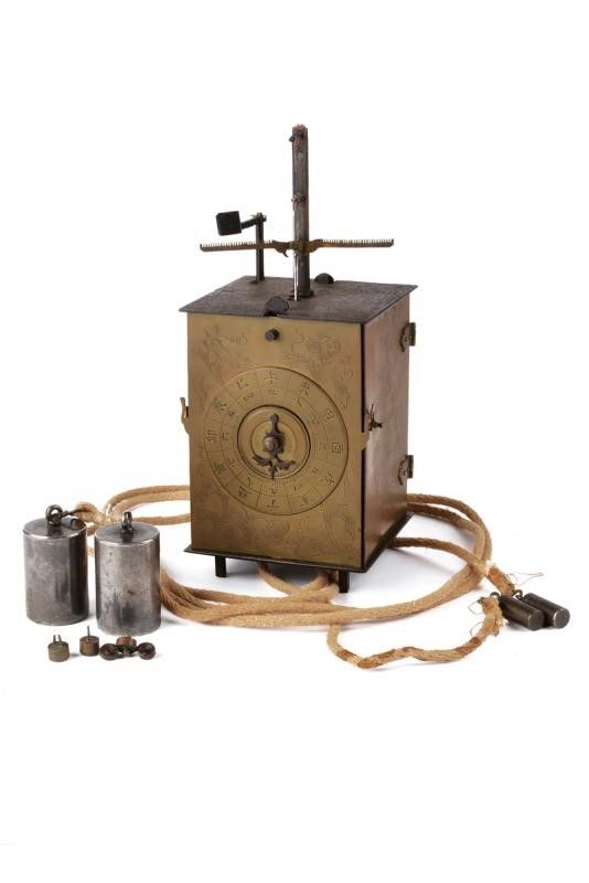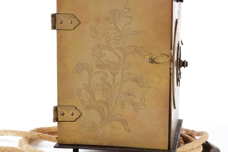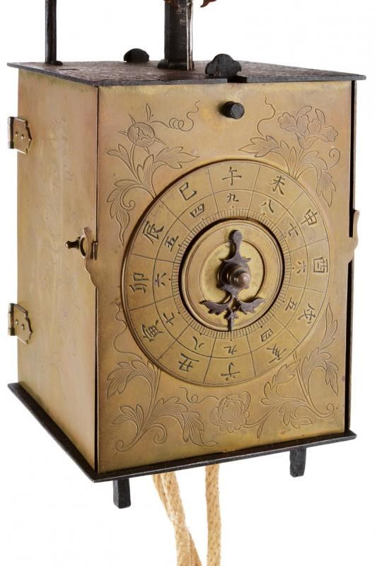 datazione: Periodo Edo (1603-1867) provenienza: Giappone, Cassa a parallelepipedo con pareti in ottone. Quella frontale con il quadrante completo di lancette, iscrizioni in ideogrammi e circondato da incisioni a racemi. Anche i fianchi incisi a racemi, apribili, per poter accedere alla meccanica interna. Il dorso e il fondo in ferro. Sempre sul fondo i cordoni con i vari contrappesi. Un tempo questo tipo di orologi era fornito di una campanella dorsale ed era montato su un piedistallo ligneo che nascondeva i cordonicini con i contrappesi. Nel periodo Edo era in uso un sistema orario variabile che risaliva al IX secolo. La giornata era divisa in dodici segmenti di differente lunghezza. Pertanto realizzare orologi meccanici che segnassero correttamente il tempo era molto complesso. Tali manufatti erano realizzati da artigiani specializzati ed avevano costi assai elevati. Solo i Daimyo, i mercanti più ricchi e i samurai d'alto rango potevano permettersi di acquistarli, così per tradizione questi sono divenuti noti come orologi 'da daimyo'. altezza 21,5 cm.