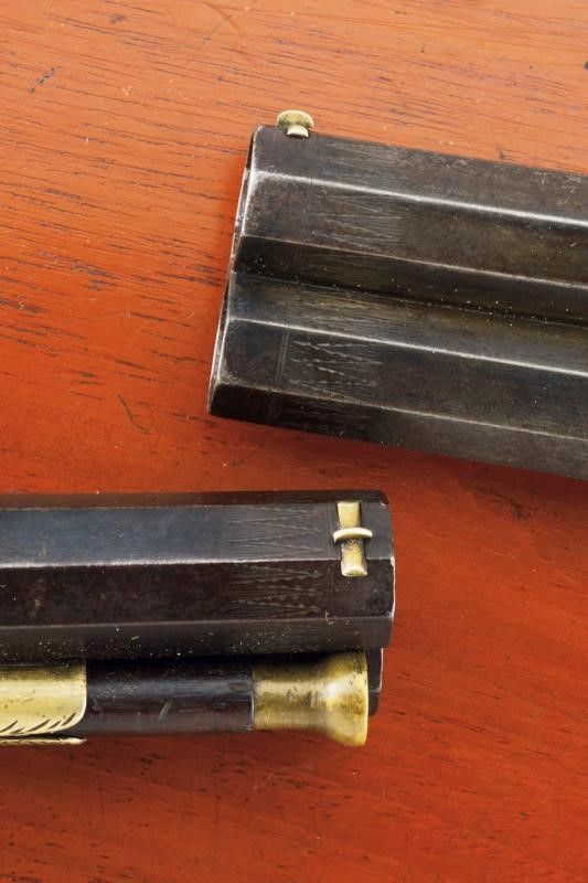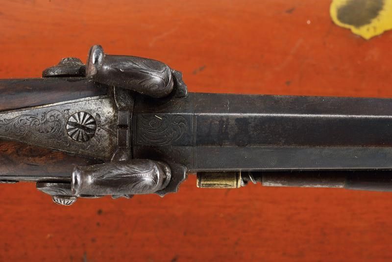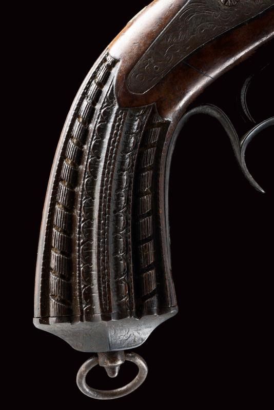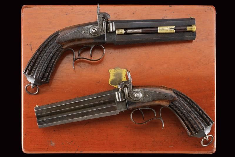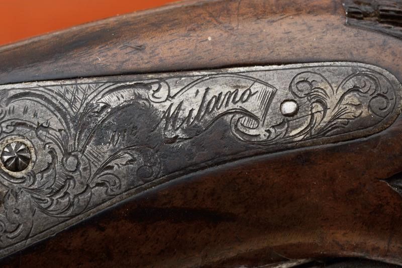 datazione: Metà del XIX Secolo provenienza: Milano, Canne ottagonali lisce, incise alle estremità, quelle superiori dotate di mirino; le volate cal. 16 mm. I blocchi di culatta con pistoni scanalati e posti verticalmente, le codette incise e munite di alzo. Batterie a molla indietro firmate 'Colombo' su un lato e 'in Milano' su quello opposto, tra fini incisioni floreali. Calci in legno con bellissimi intagli geometrici (piccole mancanze). Fornimenti in ferro incisi en suite. Ponticelli con poggiadito. Cocce con anello di sospensione. Bacchette in legno con battipalla in ottone e cavastracci in ferro. In una cassetta di legno non pertinente, rifoderata in velluto verde scuro e munita di vari attrezzi e della chiave. Le pistole nella tipica buona qualità del famoso armaiolo milanese. lunghezza 30 cm.