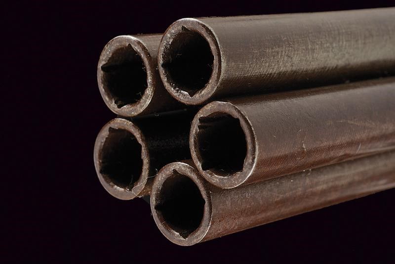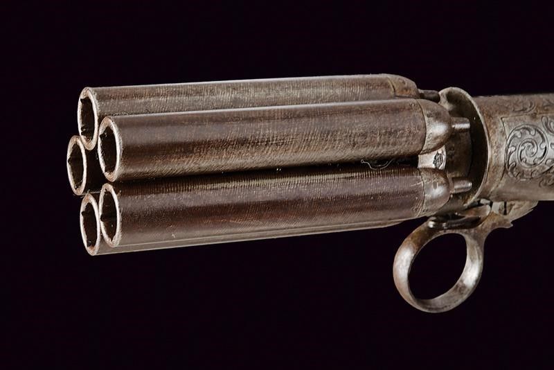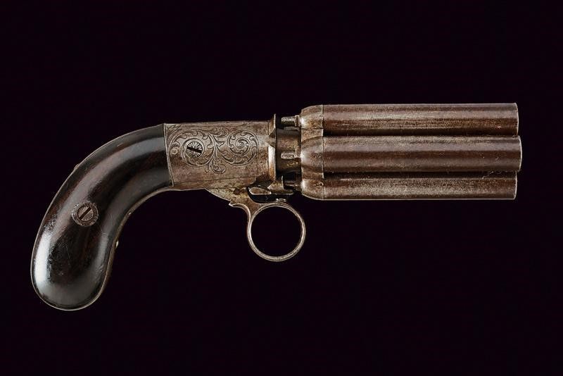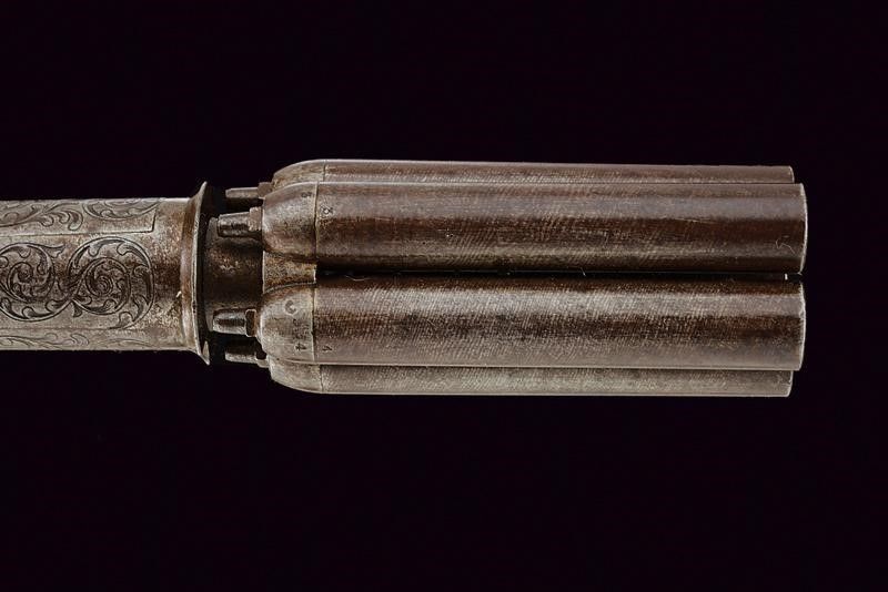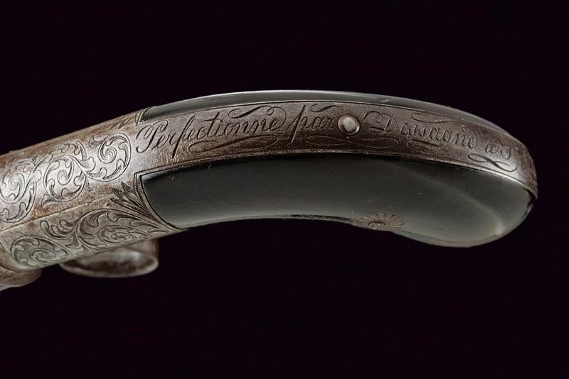 datazione: 1855 circa provenienza: St. Etienne, Canne lisce, tonde, damascate, numerate, svitabili, cal. 10 mm; castello di sezione ovale finemente inciso a motivi floreali, grilletto ad anello, con cane inferiore. Il dorso marcato 'Perfectionne par Dessagne a St. Etienne'. Guancette in legno. lunghezza 20.5 cm.