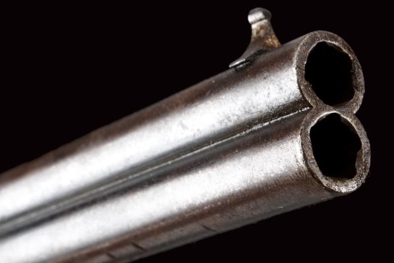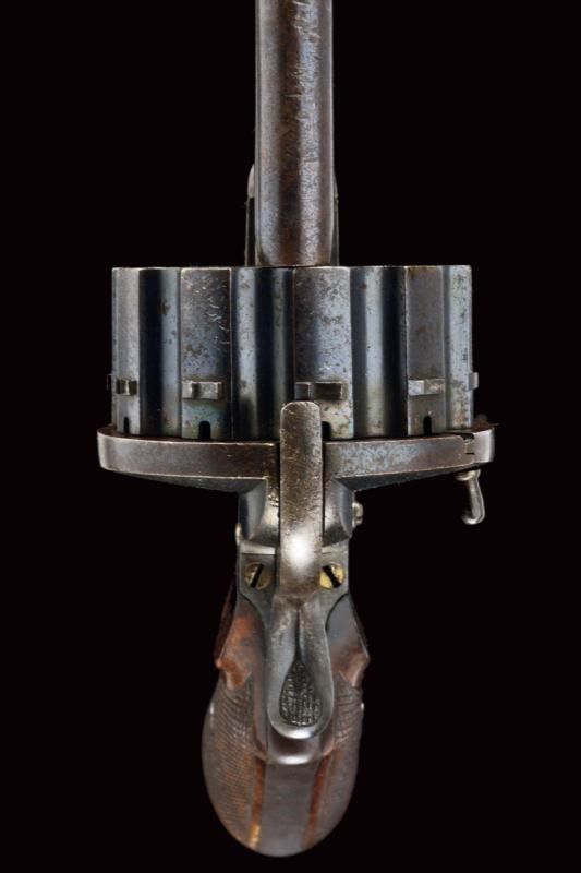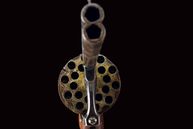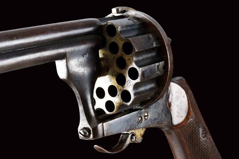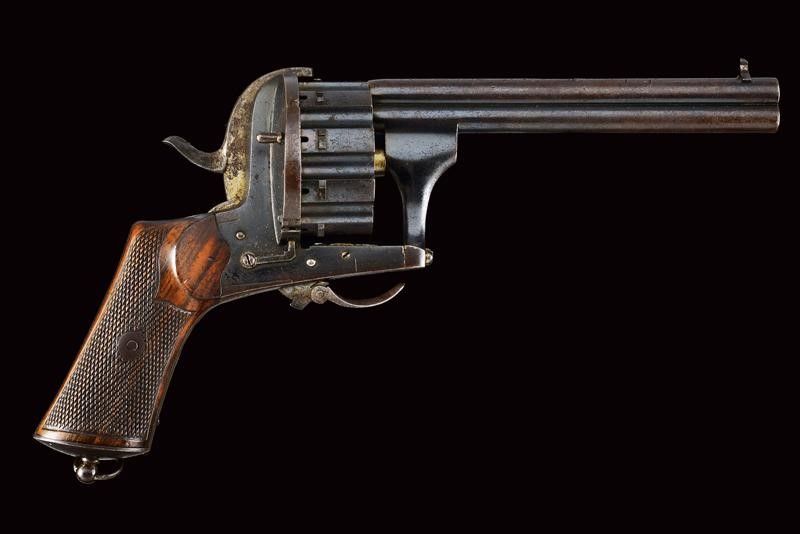 datazione: 1870 circa provenienza: Belgio, Due canne cilindriche, rigate, quella dorsale munita di mirino, cal. 7,5 mm. Rigatura visibile, qualche intaccatura all'interno. Il grande tamburo con scanalature, le camere disposte in due ordini e alternate per fare fuoco prima con la canna superiore, poi con quella inferiore, contenendo così le dimensioni del tamburo stesso e il surriscaldamento delle canne. La meccanica funzionante solo in doppia azione. Punzoni: 'G' coronato a fianco delle canne; 'LEG' con stella, 'G' e 'D' coronate sul tamburo. Qualche segno sulla canna dorsale. Conserva circa il 60% della brunitura color blu antica. Guancette in legno zigrinato. Per esemplari simili vedi 'Les Revolvers à Broche' di J.P. Bastié', pagg. 37 e 97. lunghezza 26,5 cm.