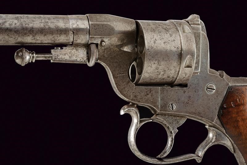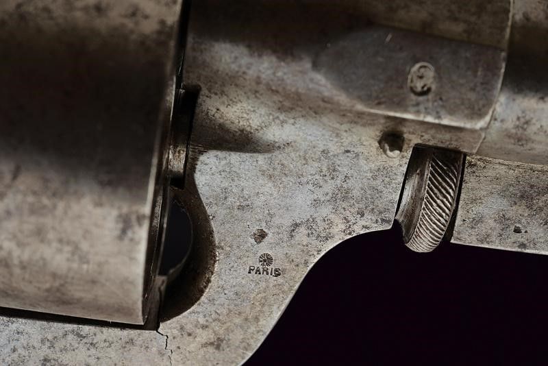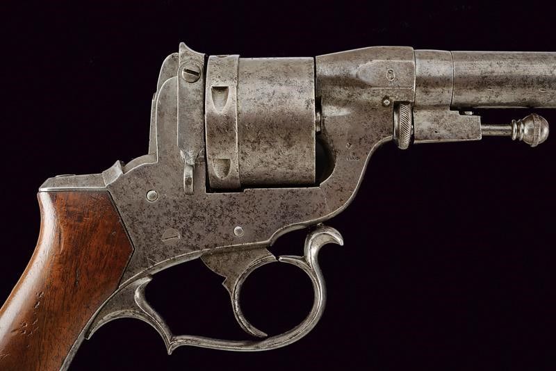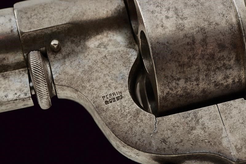datazione: 1880 circa provenienza: Francia, Canna tonda, rigata con base leggermente ingrossata e mirino, cal. 11 mm; tamburo liscio a sei colpi con matricola '1978'. Castello liscio marcato 'PERRIN & C.IE B.TE', 'PARIS' e 'L' sotto stella; sportellino di caricamento. Calcio in legno, coccia con anello di sospensione. Arma anche in dotazione ai Dragoni dello Stato della Chiesa - non si conoscono matricole superiori a 2500. lunghezza 31 cm.