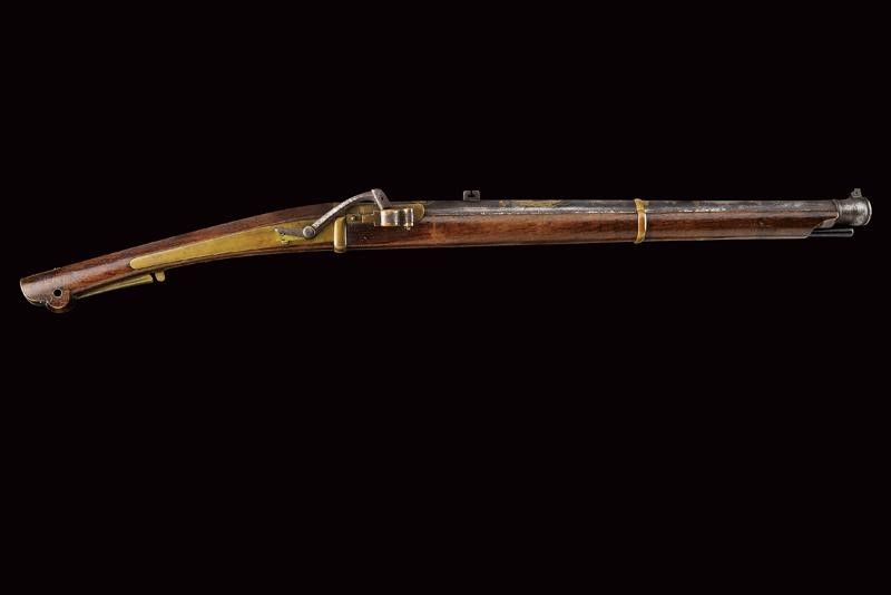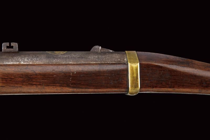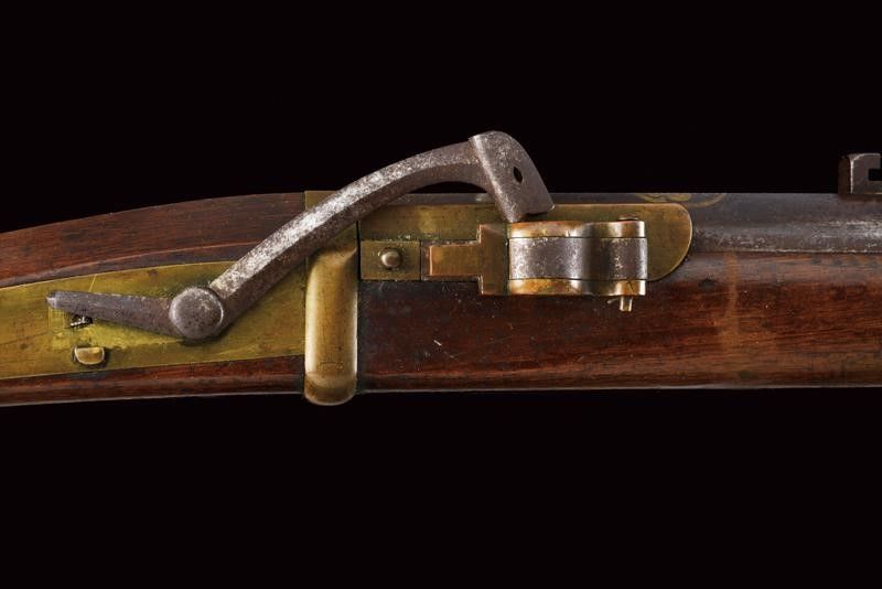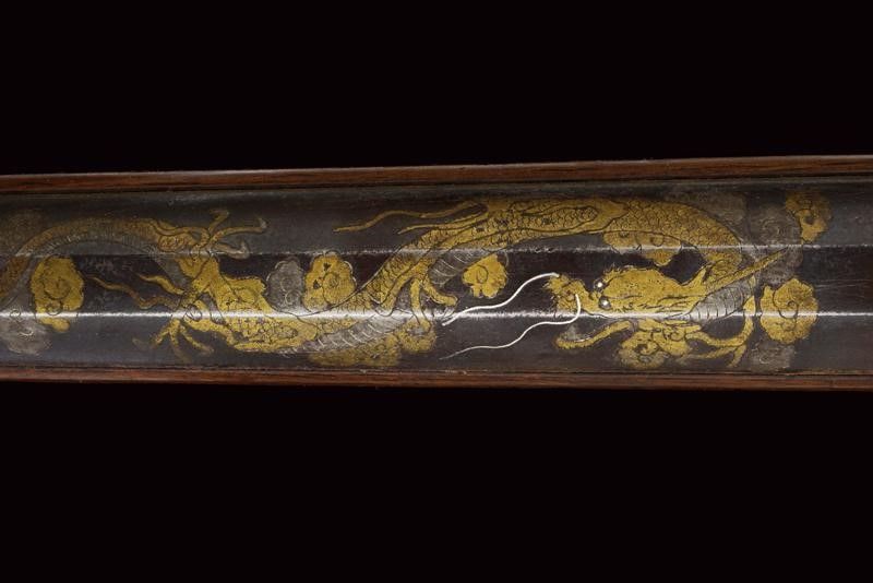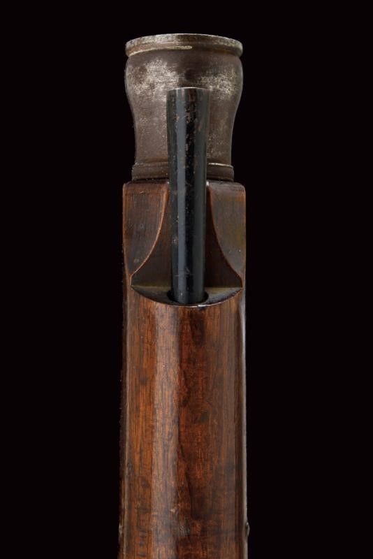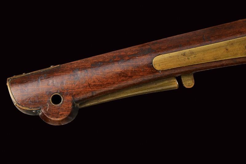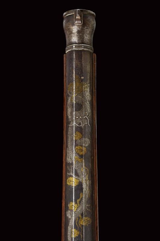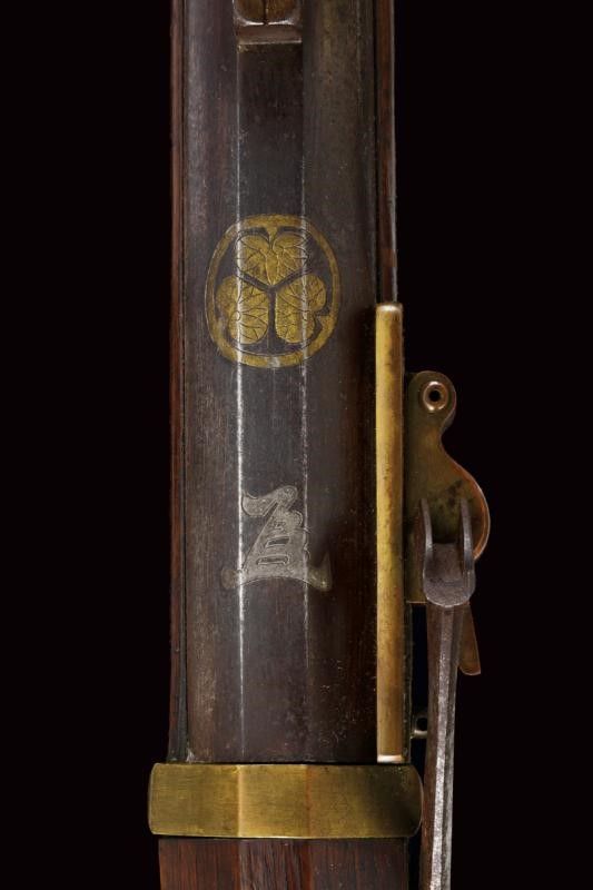 datazione: 1800 circa provenienza: Giappone, Pesante canna liscia tonda, con bindella, volata ingrossata con collo ristretto e alto mirino, decorata in argento e ottone con un kanji, effige di due draghi, nuvole e un mon dei Tokugawa; alzo rettangolare con intaglio a croce, cal. 18 mm; scodellino in ferro con copriscodellino in ottone. Batteria in ottone con cane in ferro (l'arresto non esce bene, da rivedere). Cassa intera in legno con fornimenti in ottone. Competo di bacchetta in ferro. lunghezza 109 cm.