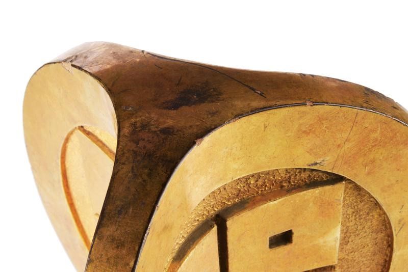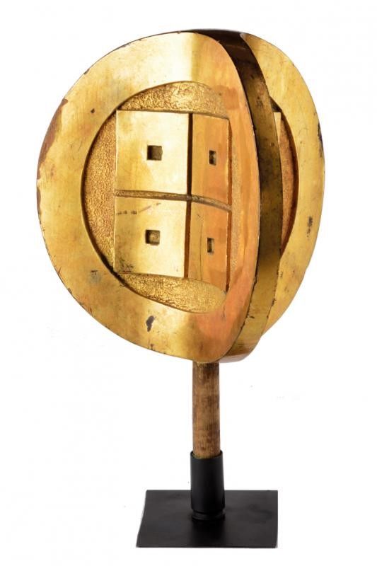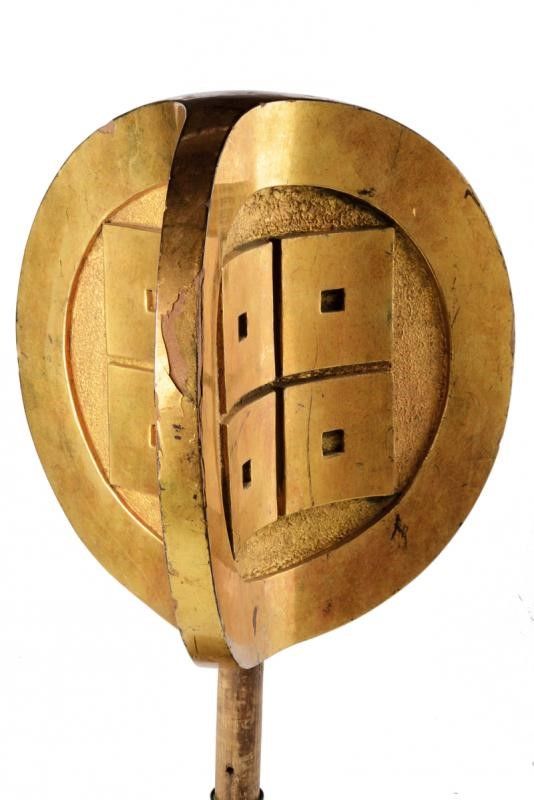 datazione: Periodo Edo (1603-1867) provenienza: Giappone, Raro puntale per uno stendardo da guerra con stemma (mon) per l'identificazione di un daimyo. In legno a tre facce incavate con 'Maru-ni Taira-yotsume Mon' a rilievo su fondo granulato. Laccato e dorato (piccole mancanze). Con resti del fusto in legno e con supporto metallico moderno. dimensioni 27 x 26 cm.