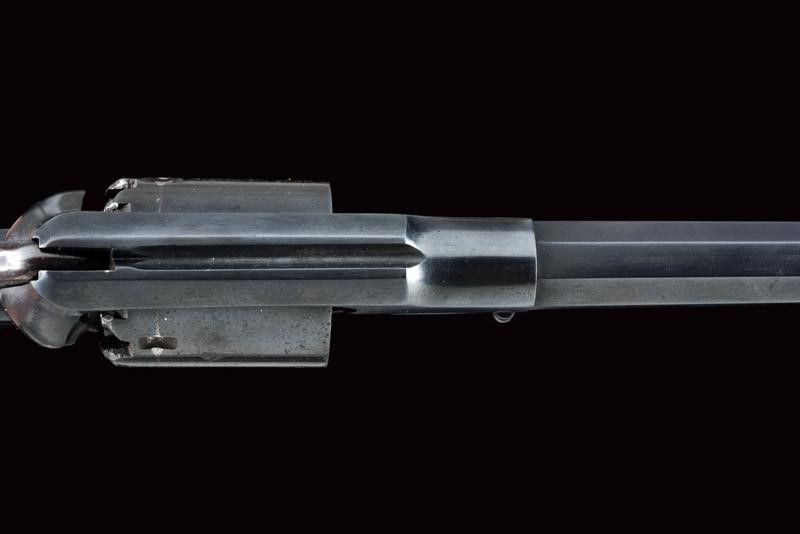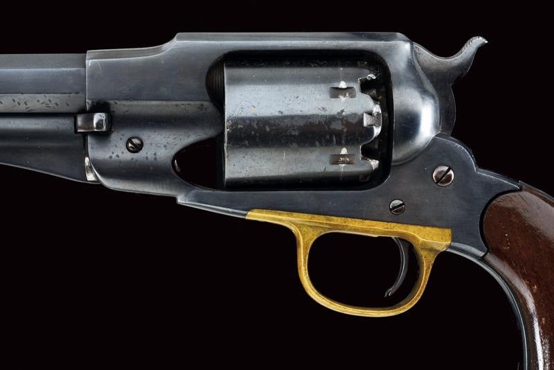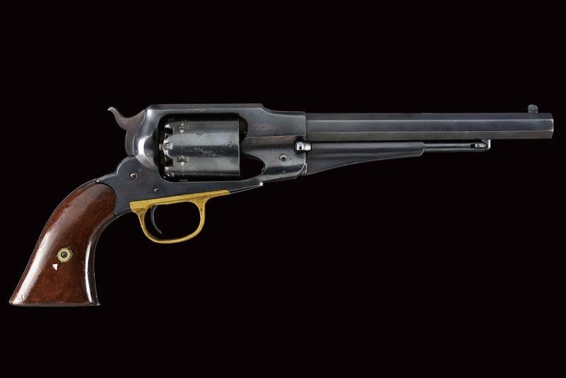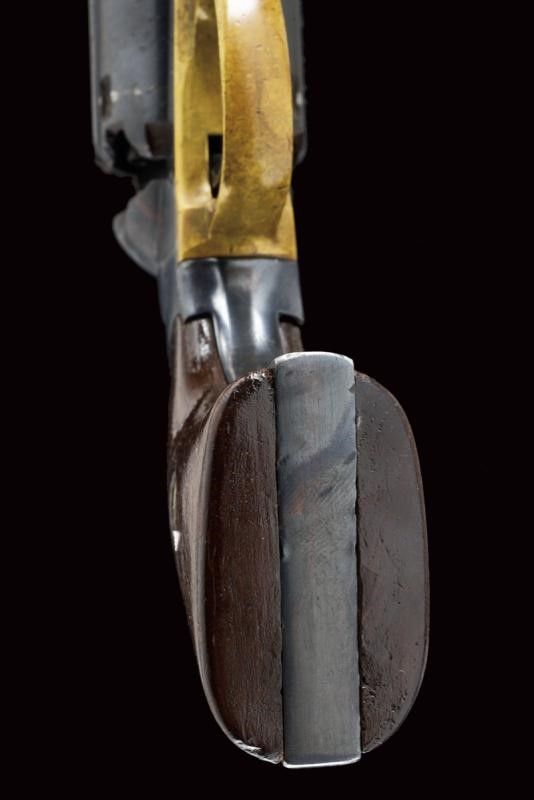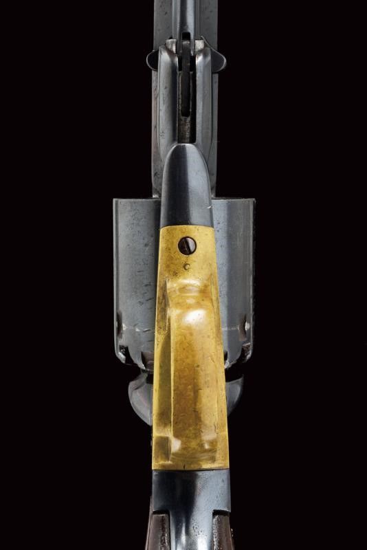 datazione: Terzo quarto del XIX Secolo provenienza: USA, Canna rigata ottagonale, marcata con dicitura del brevetto, indirizzo della ditta e 'NEW MODEL', punzonante 'C' munita di mirino in ferro, cal. 44; tamburo liscio a sei colpi; castello con scanalatura superiore, munito di caricatore, ponticello in ottone, punzonato 'C' ; impugnatura con guancette lisce in legno. Ri-brunita, matricola '487xx'. lunghezza 37 cm.