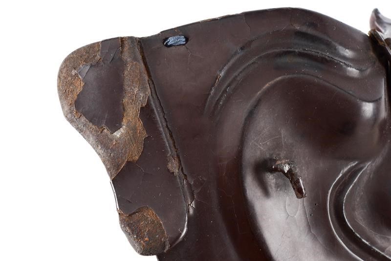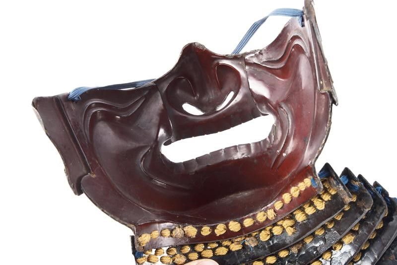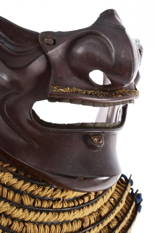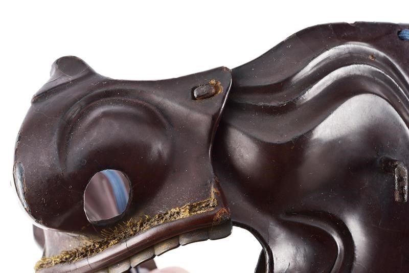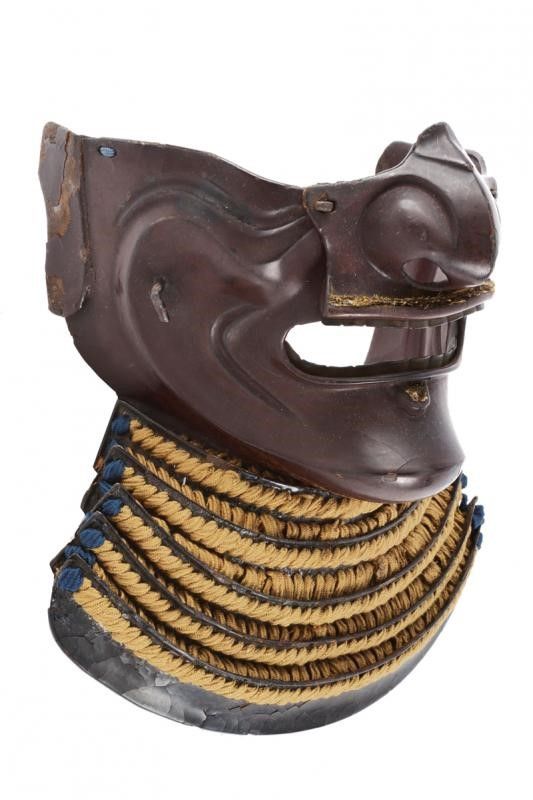 datazione: Periodo Edo (1603-1867) provenienza: Giappone, Ressei Menpo (maschera da guerra con espressione feroce) in ferro a lacca bruna, completo di naso amovibile e resti di mustacchi; yodarekake a cinque lame con allacciatura in seta chiara in stile kebiki. Piccoli danni alla lacca. altezza 25 cm.
