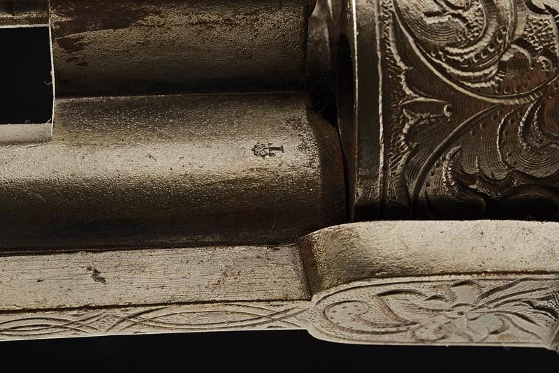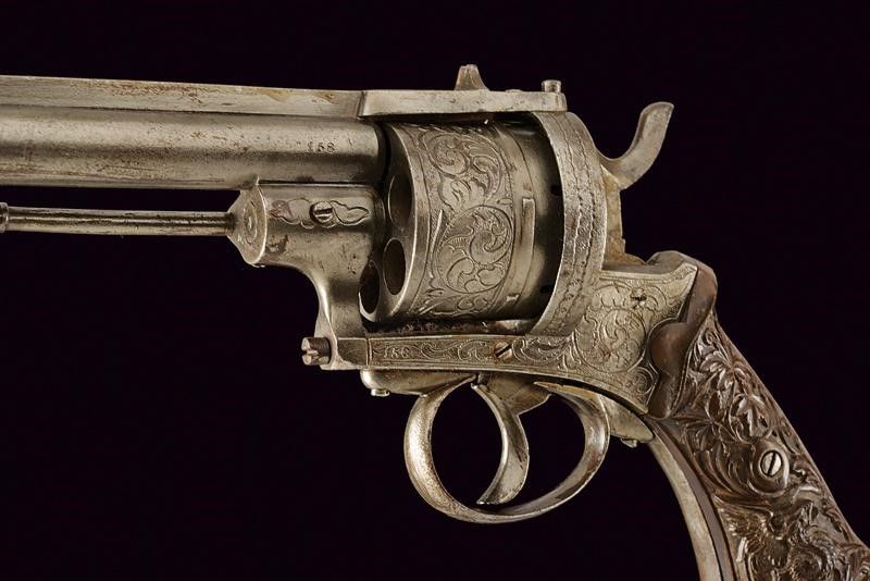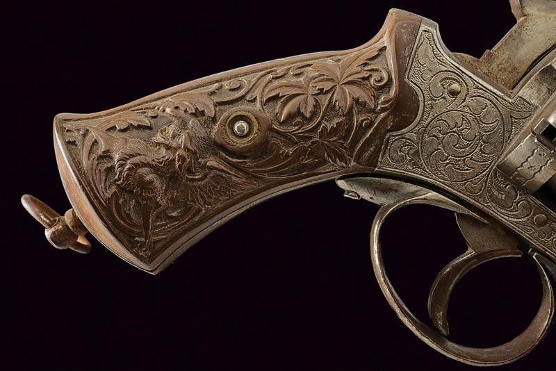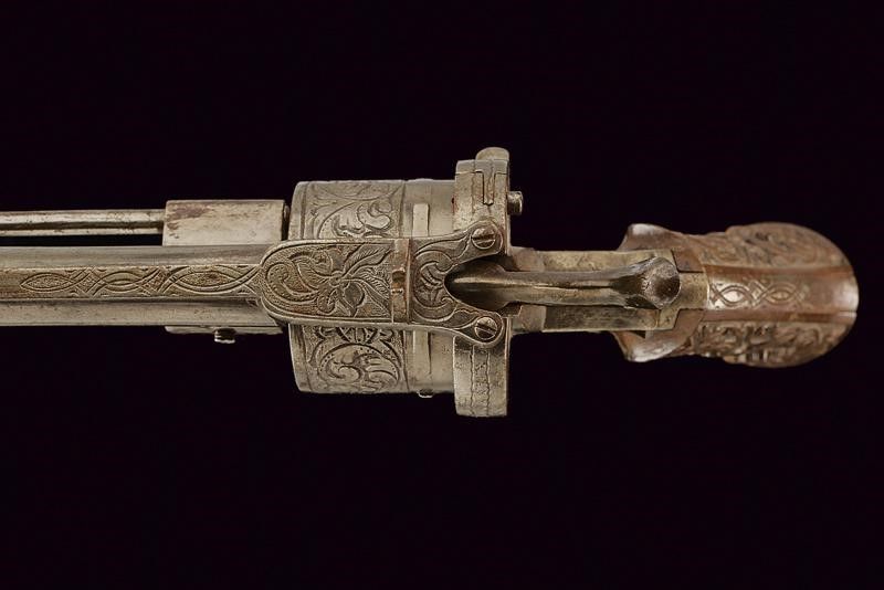 datazione: Terzo quarto del XIX Secolo provenienza: Europa, Canna cilindrica con bindella dorsale, alzo e mirino, cal. 11 mm. Incrostazioni all'interno. Tamburo a sei colpi con incisioni a racemi su fondo a granuli. Resti di punzone 'T' coronato. Meccanica funzionante in singola e doppia azione. Castello inciso en suite. Segni d'uso e del tempo. Impugnatura in materiale color marrone ornata in rilievo a racemi e con grifoni. lunghezza 28 cm.