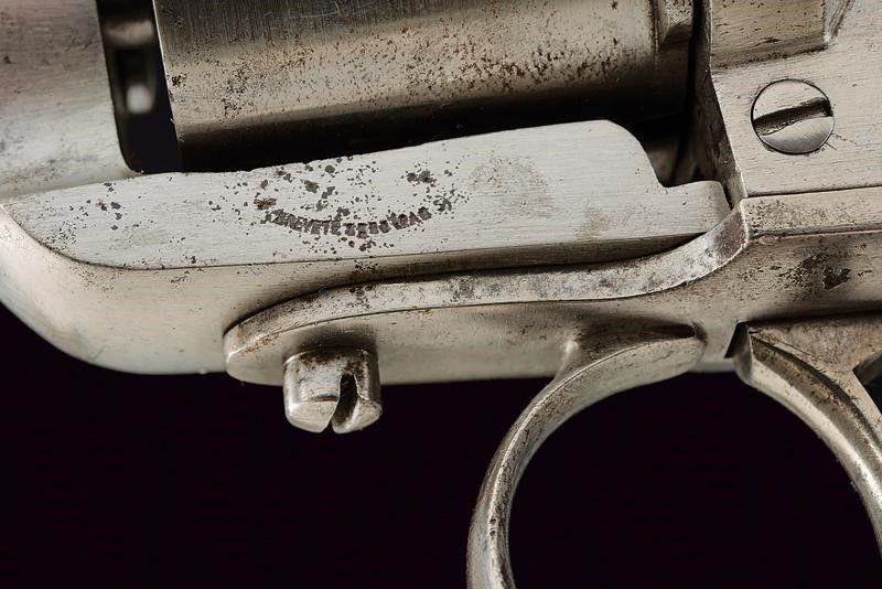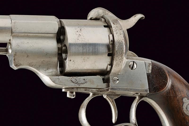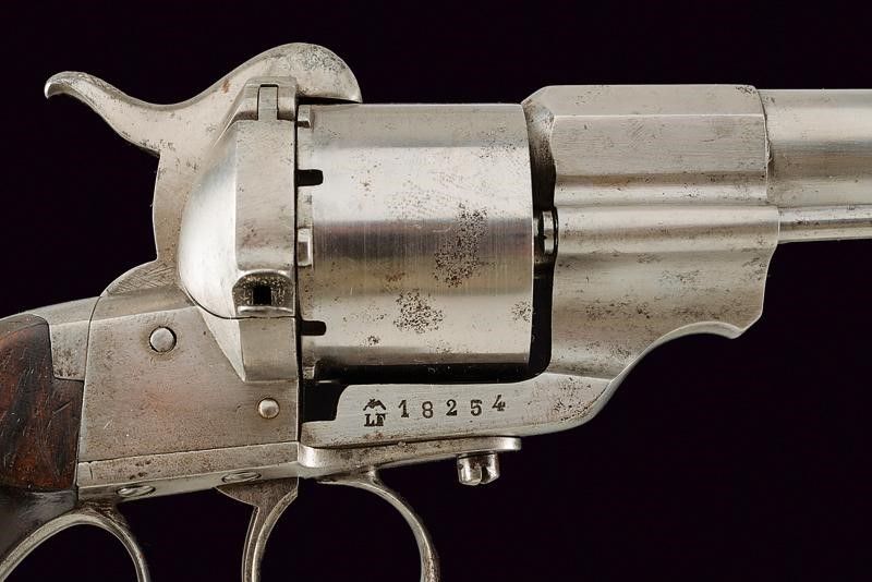 datazione: 1859 - 1874 provenienza: Francia, Canna cilindrica rigata, dotata di mirino, recante al dorso resti di marcatura 'INV.ON E LEFAUCHUX BR.TE PARIS', cal. 11 mm. Anima pulita, rigatura visibile. Tamburo a sei colpi. Qualche intaccatura sul lato sinistro. Matricola 'LF 18xxx'. Resti di marcatura sempre sul lato sinistro. Guancette in legno. Meccanica funzionante. Ponticello del tipo con poggiadito, coccia a facce sgusciate. Nel 1861 il comando delle forze italiane cominciò a studiare un revolver da dotare ai Carabinieri in sostituzione delle pistole a luminello, il revolver era basato sul modello Lefaucheux al quale sarebbe anche stato commissionato, nel frattempo furono acquistati dalla ditta 3000 esemplari a canna normale (lunga) e 5000 a canna corta. Generalmente la prima partita di ordini si presume avesse matricole comprese fra il 19000 e 31000. Il modello qui presentato è leggermente inferiore, bisogna ricordare però che spesso gli ufficiali italiani acquistavano questi revolver privatamente. Vedi 'Pistole Militari Italiane' di L. Salvatici pagg. 88-91 e 'Les Revolvers a Broche' di J.O Bastié, pagg. 48-49. Per un esemplare simile vedi foto a pag. 91 del volume di Salvatici. lunghezza 29,5 cm.