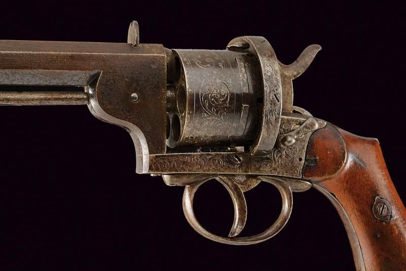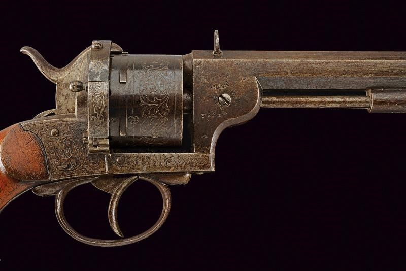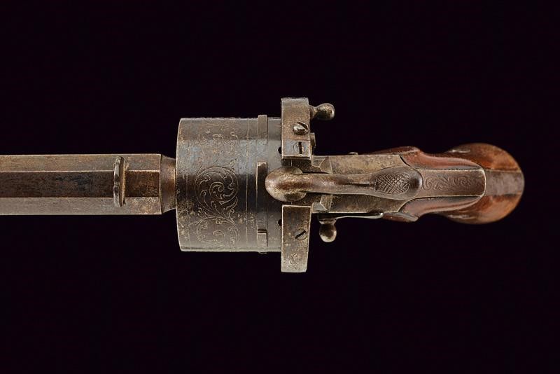 datazione: Terzo quarto del XIX Secolo provenienza: Belgio, Canna ottagonale rigata (l'interno da pulire, rigatura visibile) dotata di alzo e mirino, cal. 11 mm. Marcatura 'ARENDT BREVETE' e un punzone. Tamburo a sei colpi con incisioni a racemi e timbro del banco di prova di Liegi. Castello con incisioni a racemi. Sicura esterna sul lato sinistro. Resti di brunitura antica. Qualche segno d'uso e del tempo. Meccanica funzionante in singola e doppia azione. Guancette lisce in legno. Estrattore del tipo disgiunto, alloggiato sotto la canna, munito di gancio di blocco, deve essere rimosso per poter essere impiegato. lunghezza 28,5 cm.