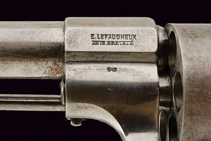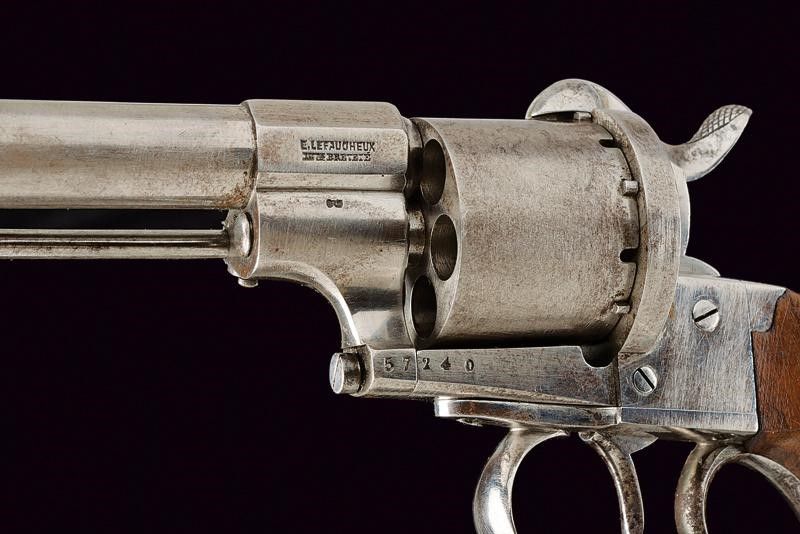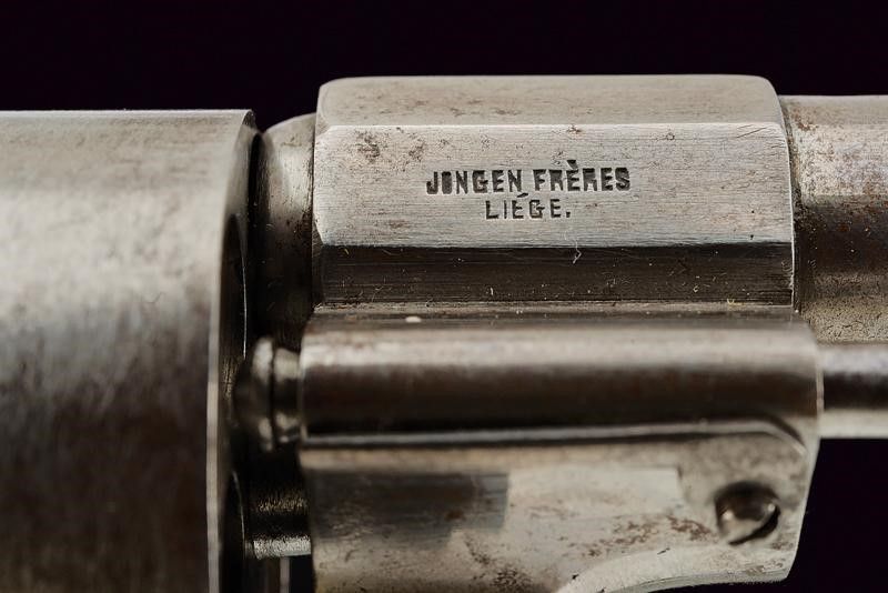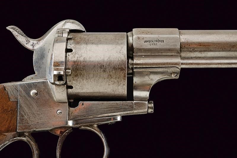 datazione: 1858 - 1870 circa provenienza: Belgio, Canna cilindrica rigata, dotata di mirino, cal. 11 mm. Tamburo a sei colpi con marchi del banco di prova di Liegi. Marcature 'E. LEFAUCHEUX INV.R BREVETE' e 'JONGEN FRERES LIEGE', matr. '57240', punzone 'G' coronato. Meccanica ben funzionante. Guancette lisce in legno. Anello porta correggiolo. Ponticello del tipo con poggiadito, coccia tondeggiante. Un revolver di produzione belga su brevetto di Lefaucheux.Quando la marina e poi l'esercito italiano cominciarono a introdurre i revolver a spillo su brevetto Lefaucheux, molti ufficiali italiani acquistarono privatamente tali revolver, che erano prodotti anche per il mercato civile. Vi erano anche esemplari di produzione belga. Si veda un esemplare assai simile al nostro, illustrato in 'Pistole Militari Italiane di L. Salvatici' (pag. 92 in basso), con didascalia: 'Un'imitazione belga del revolver modello Lefaucheux. Armi di questo genere furono acquistate privatamente da ufficiali e da volontari, in alternativa a quelle originali.' lunghezza 29 cm.