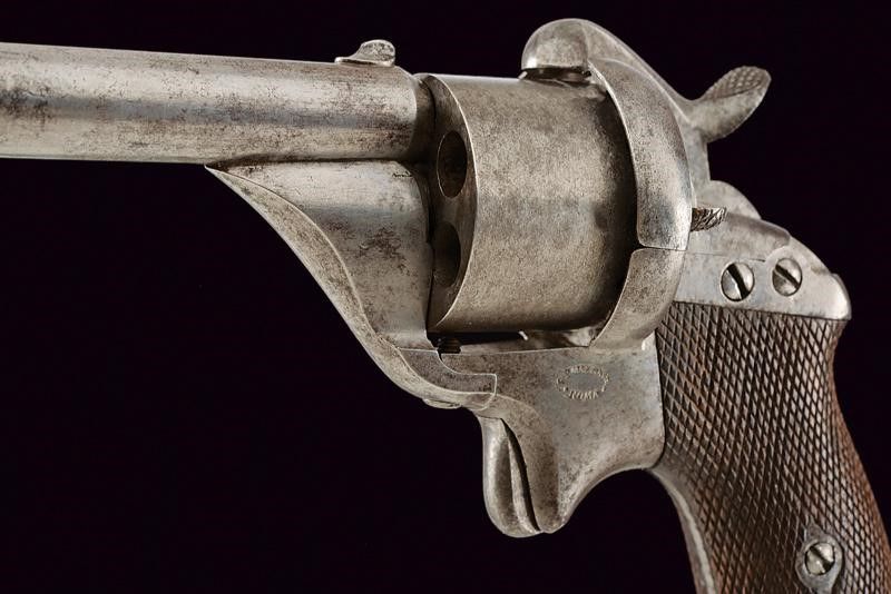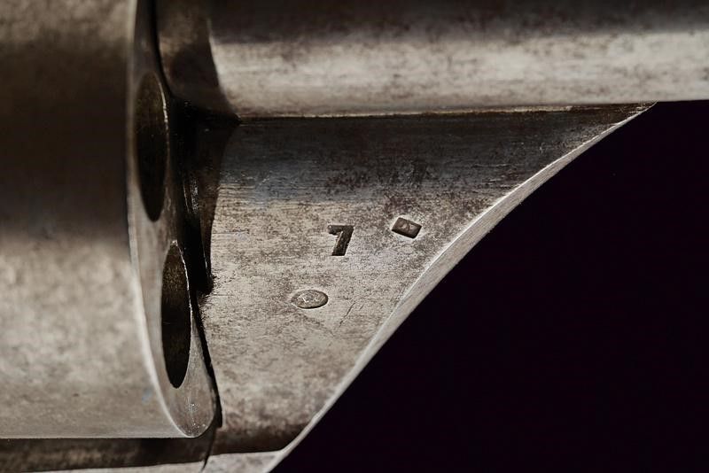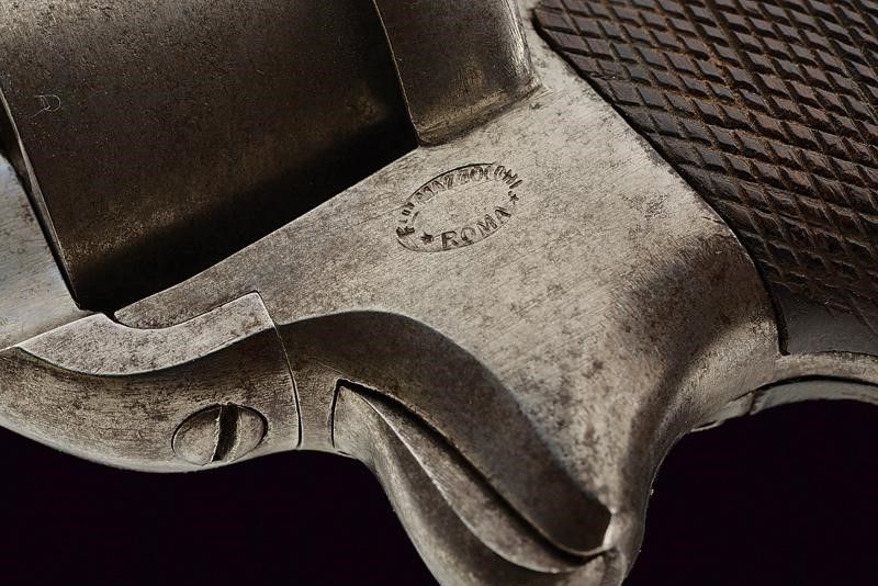 datazione: 1870 circa provenienza: Stato Pontificio, Canna tonda rigata, munita di mirino, cal. 9 mm; tamburo liscio, a sei colpi; castello in ferro, punzonato e marcato 'F.LLI MAZZOCCHI ROMA', dotato di sportellino di caricamento sul fianco sinistro; impugnatura con guancette in legno zigrinato e anello di sospensione. Matricola '7', vari punzoni. Questo raro revolver è stato costruito a Roma, per la Pontificia gendarmeria, dalla ditta Mazzocchi, sul modello del brevetto belga 'Chamelot et Delvigne'. lunghezza 20.5 cm.
