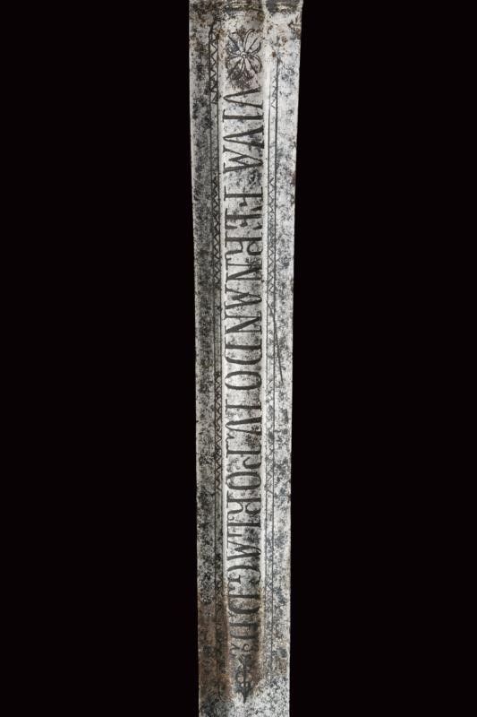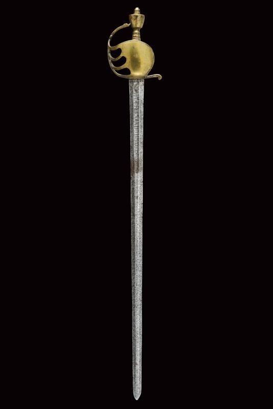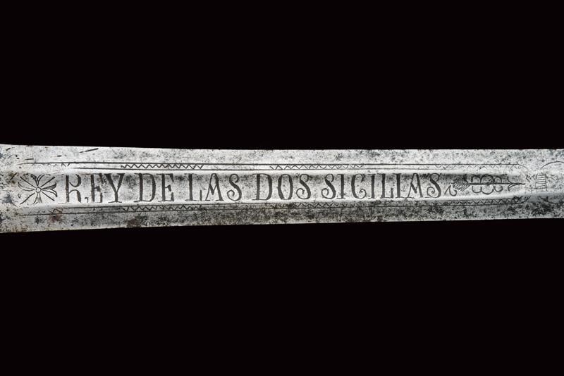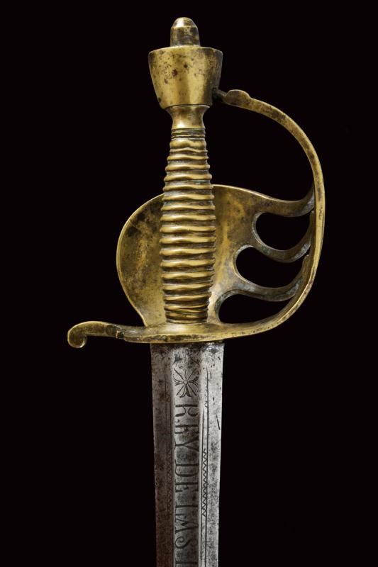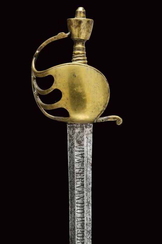 datazione: ultimo quarto del XVIII Sec. provenienza: Regno di Napoli, Larga lama a due fili di sezione esagonale; la prima parte scanalata, incisa a motivi floreali e geometrici e con motto 'VIVA FERDINANDO IV POR LA GDD.s' e 'REY DE LAS DOS SICILIAS'. Fornimento in ottone massiccio, grande vela liscia con bordo delineato, guardia a quattro rami, pomo a cuneo, impugnatura in ottone a spire. Molto rara. lunghezza 94 cm.