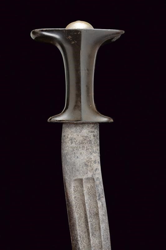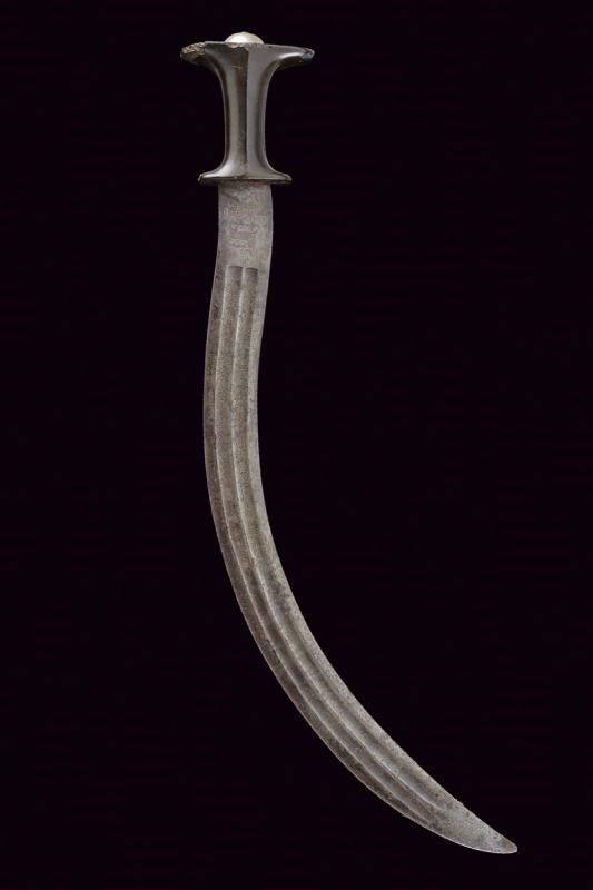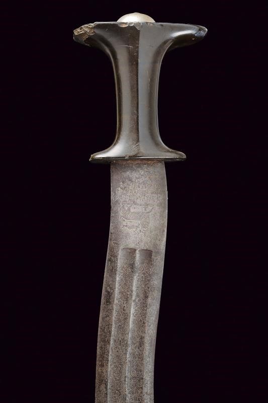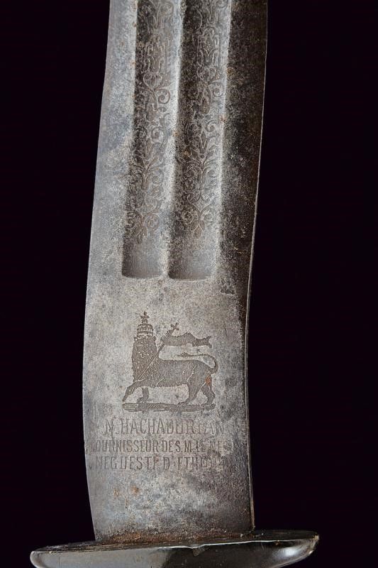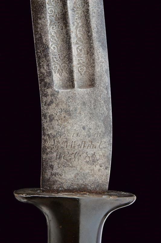 datazione: 1900 - 1940 circa provenienza: Etiopia, Lama controcurvata a due fili, ornata su entrambe le facce con due sgusci arricchiti per metà con incisioni a racemi. Al tallone su un lato iscrizione in amarico, sull'altro bellissimo Leone di Giuda sormontanti la dicitura di un fornitore 'N. NACHADURIAN FOURNISSEUR DES M.LE NEGUS NEGUESTI D'ETHIOPIE'. Impugnatura in materiale sul tipo della bachelite (qualche mancanza) con cappellotto liscio in ottone. Negus Neghesti (NEGUS NEGUESTI) significa 'Re dei Re' (ovvero Imperatore). La carica fu ricoperta per ultimo da Hailé Selassié dal 1930 al 1936 e poi nuovamente dopo il 1940, quando l'Etiopia venne liberata. lunghezza 71 cm.