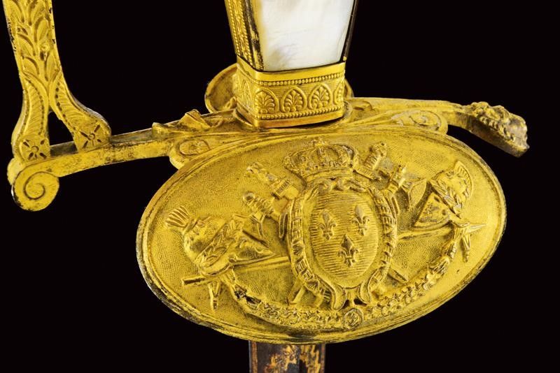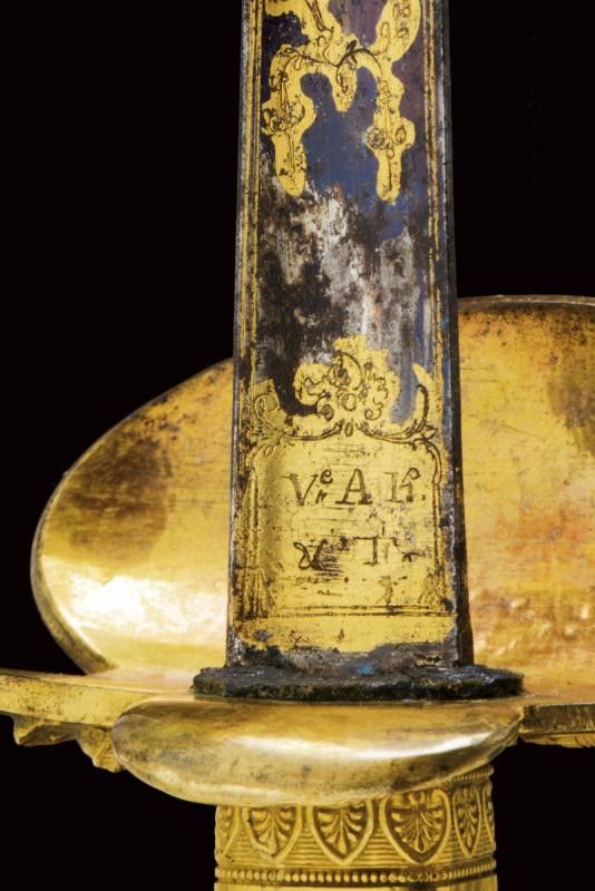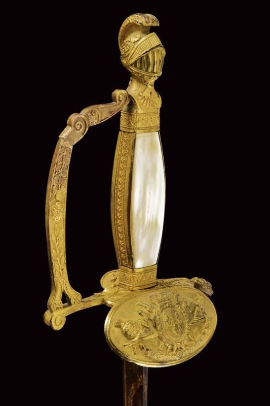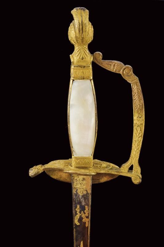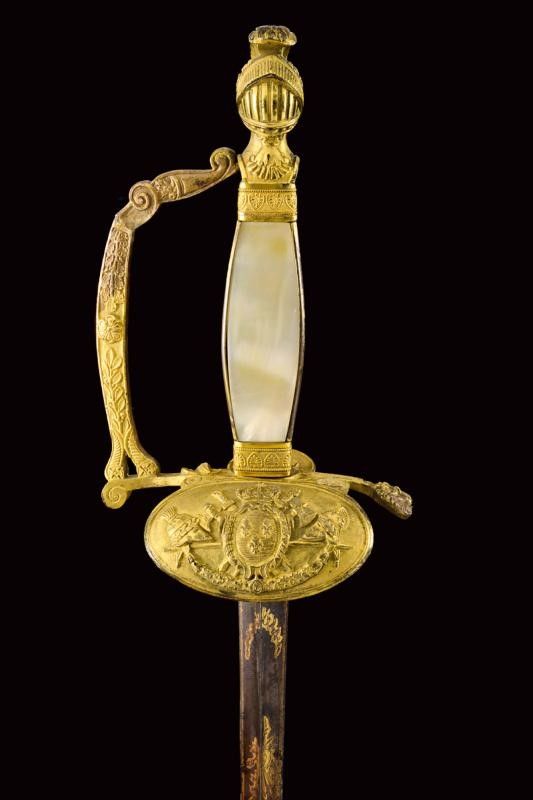 datazione: 1830-40 provenienza: Regno delle Due Sicilie, Lama di sezione triangolare con facce incavate, la prima parte incisa e dorata su fondo blu a trofei e motivi floreali, la base marcata 'V.e A.K & I'; fornimento in ottone dorato, la pelta con stemma a tre gigli sotto corona fra elmi ed armi, braccio dell'elso a testa di leone, ramo di guardia a motivi floreali e pomo a elmo piumato. Guancette in madreperla. Privo di fodero. lunghezza 96 cm.