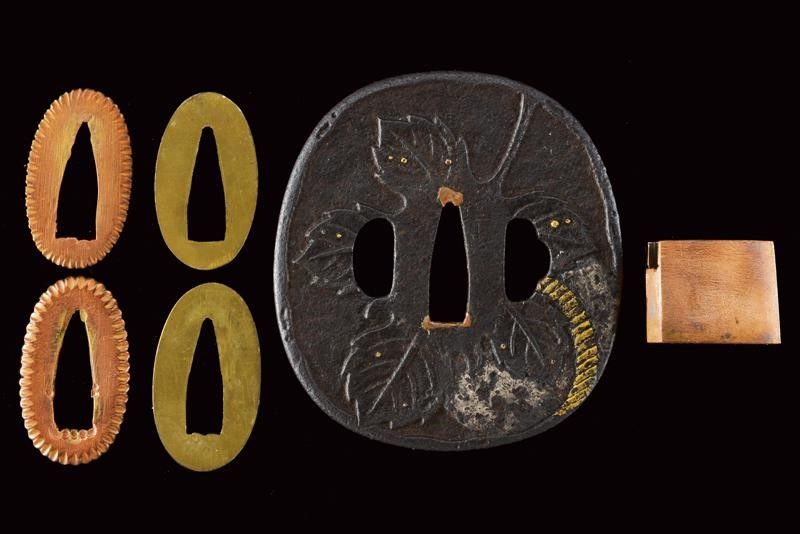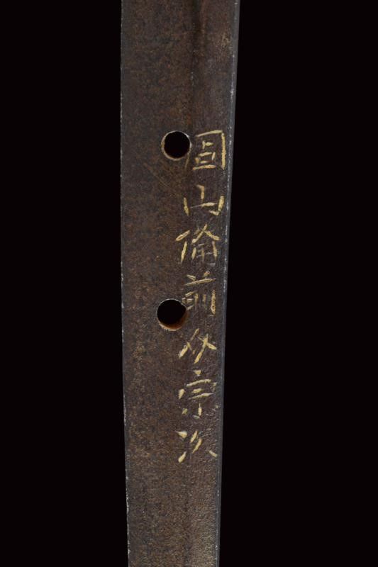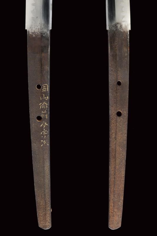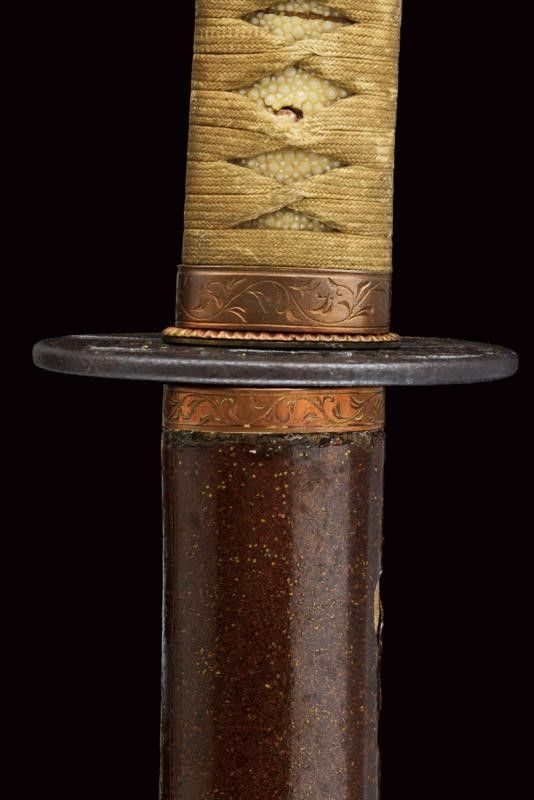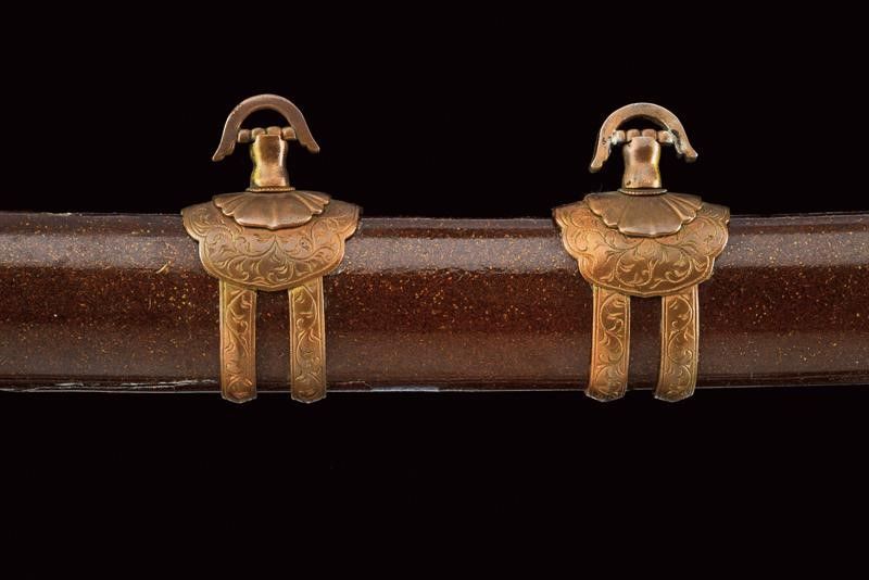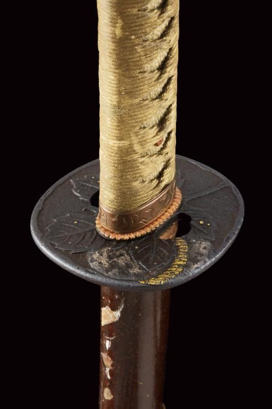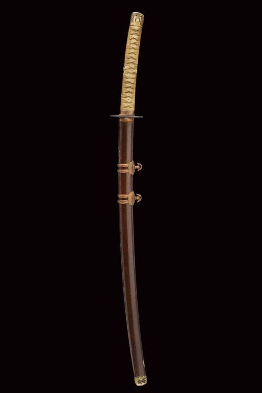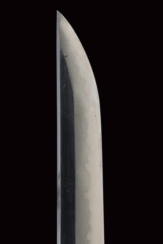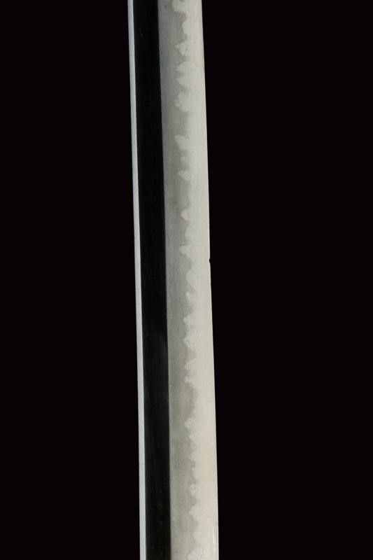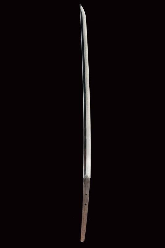 datazione: Periodo Edo (1603-1867) provenienza: Giappone, Shinogizukuri-iorimune. La lama in buone condizioni con nagasa di 69 cm; hada: non visibile; hamon: choji midare gunome; boshi: ko maru kaeri yoru; habaki in rame. Nakago gimei: Koyama Bizen Hise Munetsugu con due mekugi-ana. Koshirae con tsuba in ferro, tate-maru-gata, unisiku-bori, ten-zogan, a motivi floreali, uchi-gaeshi-mimi. Fornimenti handachi in rame e ottone, menuki mancanti. Saya in legno laccato marrone scuro con ashi incompleti. Periodo Shinshinto, metà XIX secolo. lunghezza 96.8 cm.