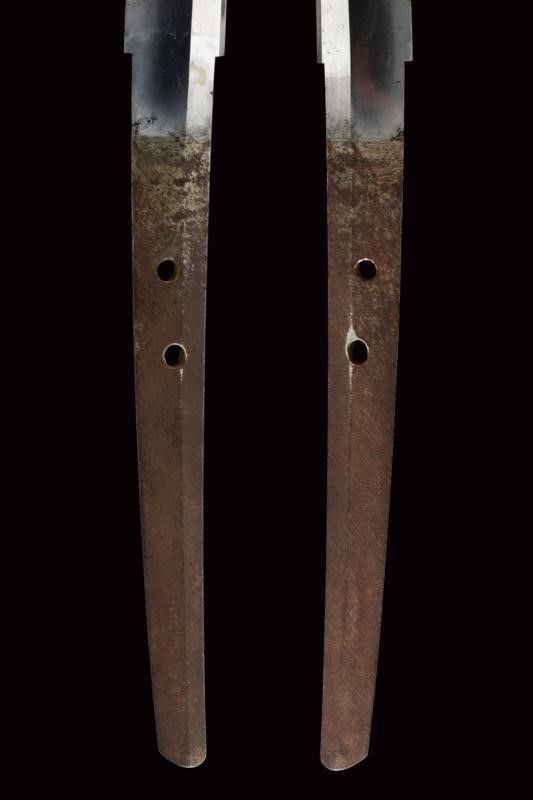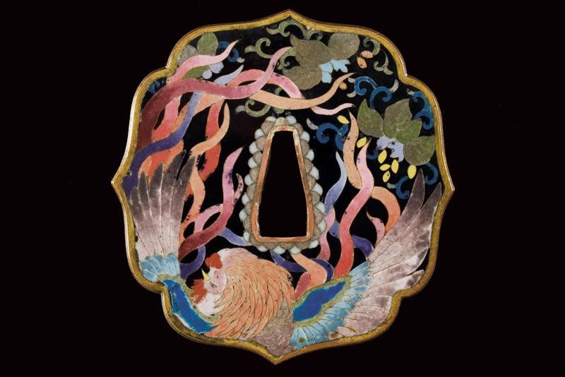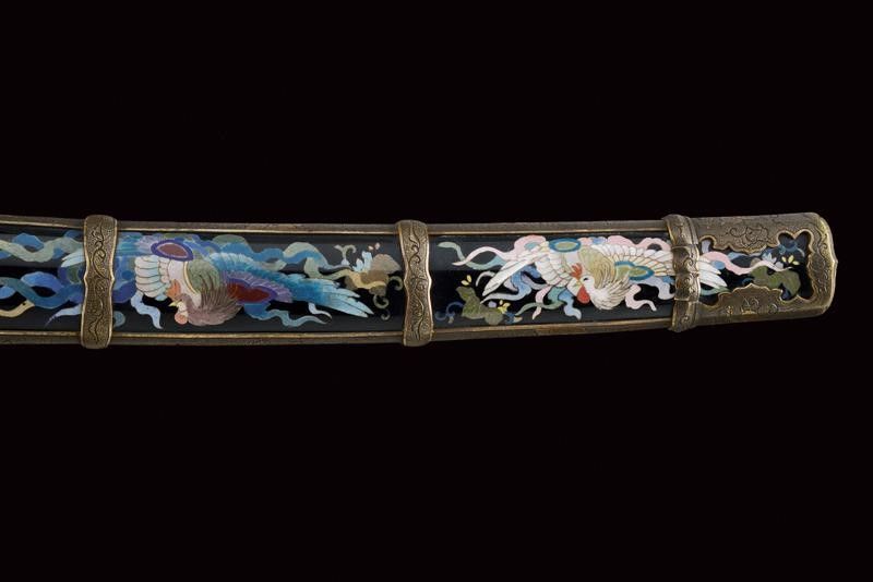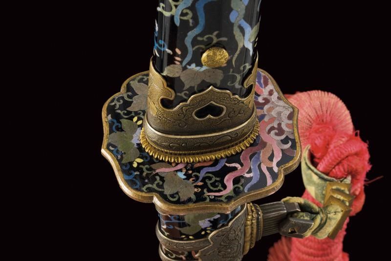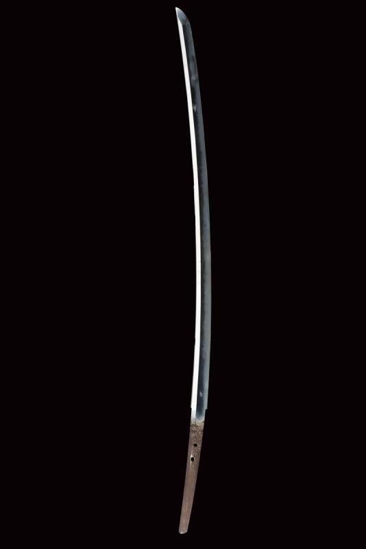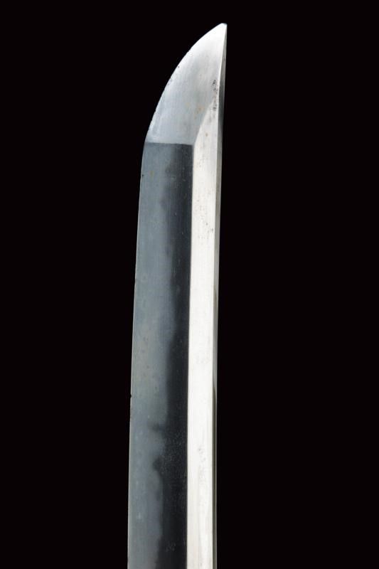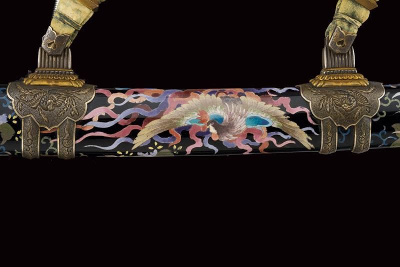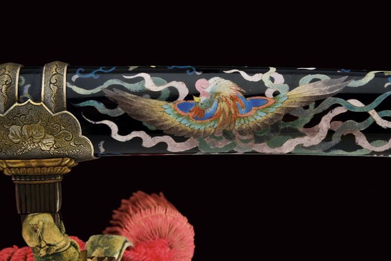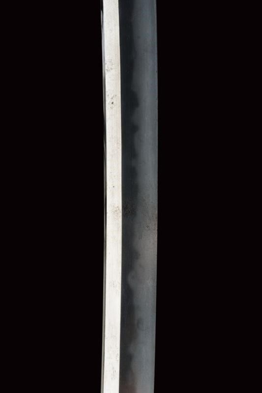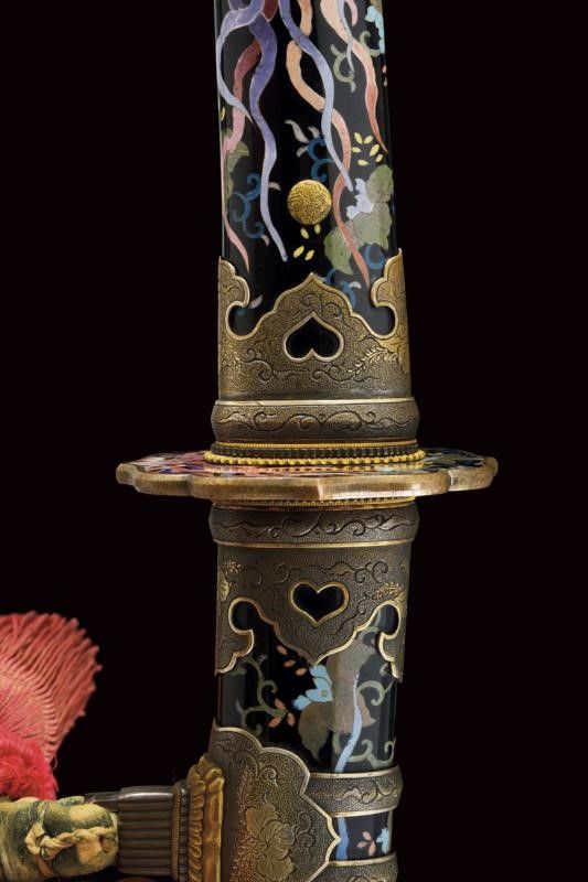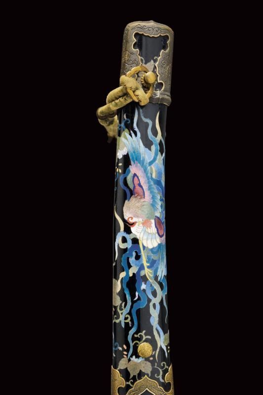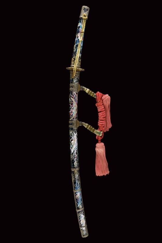 datazione: Periodo Taisho (1912-1926) provenienza: Giappone, Nagasa (lung. 74 cm), shinogi zukuri iorimune; hada: ko mokume molto compatto; hamon: gunome choji midare nie deki ashi nioi tobakaki; boshi: komaru kaerijoru; habaki in rame dorato. Nakago ubu-ha agari kurijuri yasuri sujikai con due mekugi-ana. Scuola Tokuden. Bellissimo koshirae con smalti policromi raffiguranti draghi e fiorami su fondo nero, tsuba in rame dorato decorata en suite. Fornimenti da tachi in ottone, riccamente incisi con uccelli e fiorami, parzialmente traforati e argentati. L'impugnatura con pendente in cuoio e metallo dorato. Attacchi della saya in vari metalli e cuoio dipinto. Molto raro. lunghezza 106.5 cm.