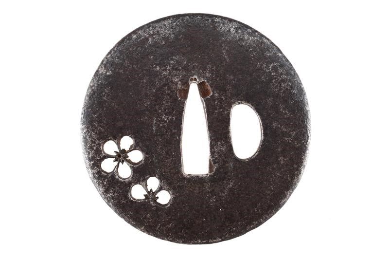 datazione: Periodo Edo (1603-1867) provenienza: Giappone, In ferro, maru-gata, sukashi con fiori, kozuka hitsu-ana, ko-maru-mimi. In kiri-box. dimensioni 7 x 7 x 4 cm.