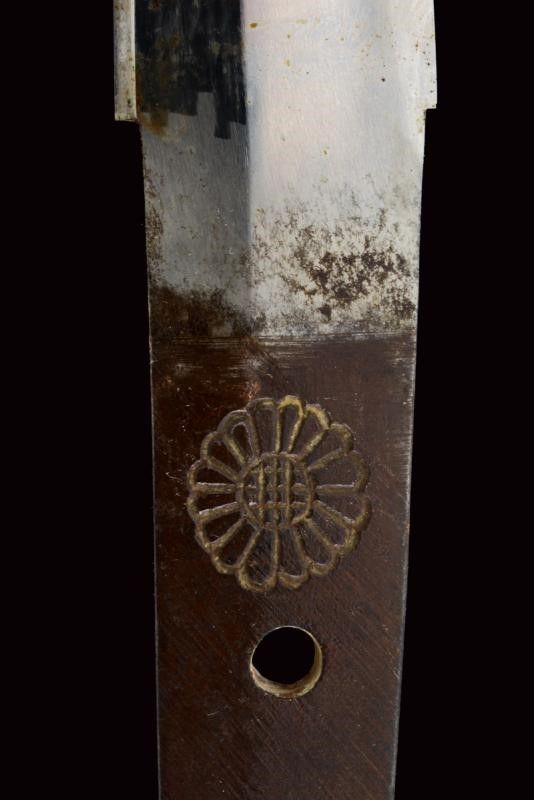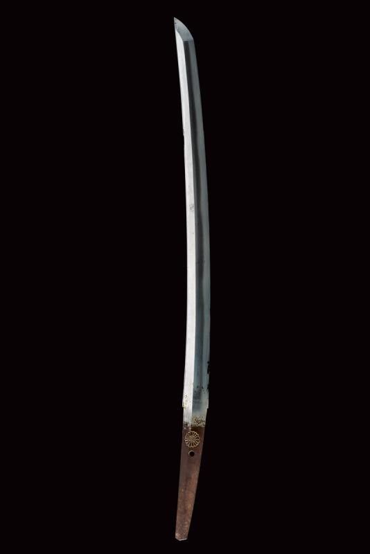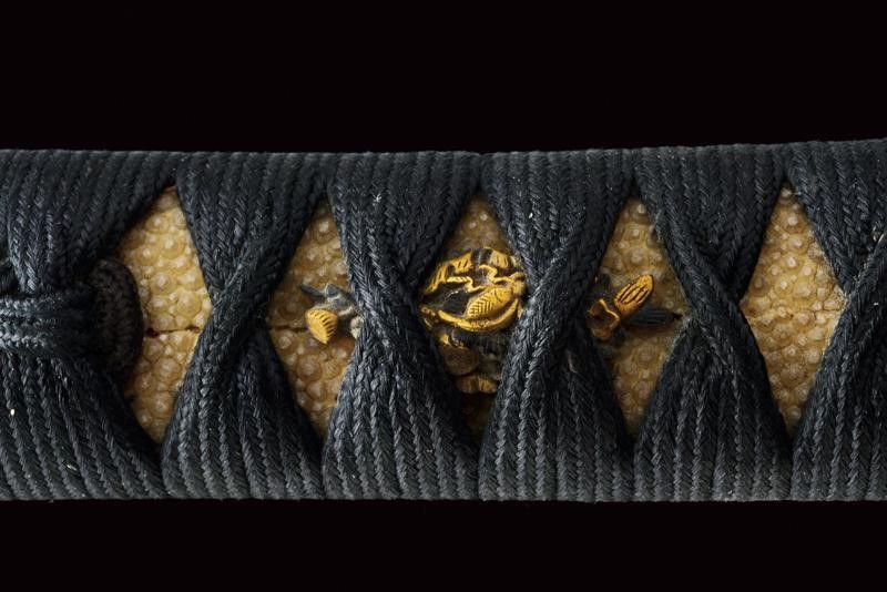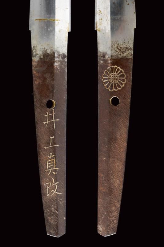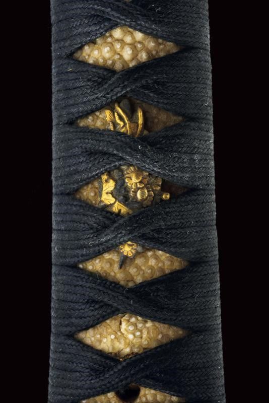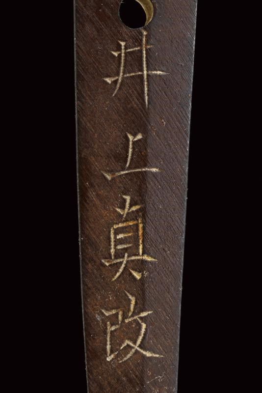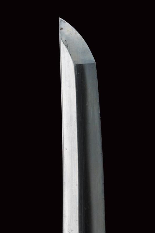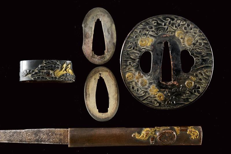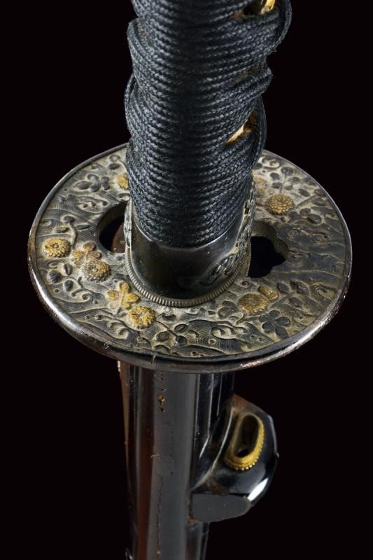 datazione: Periodo Edo (1603-1867) provenienza: Giappone, Nagasa (lung. 45.5 cm) con hada e hamon non visibili, da pulire, habaki in rame dorato. Nakago gimei: Inoue Shinkai con un mekugi-ana. Koshirae con tsuba in shakudo incisa a motivi floreali in rilievo parzialmente dorati. Bei fuchi-kashira e menuki in shakudo decorati in rilievo, parzialmente dorati su fondo scuro, kashira con un bellissimo airone. Completo di tsuka-ito in seta nera. Saya in legno laccato di nero (mancanze). Kogatana-mei. lunghezza 64,5 cm.