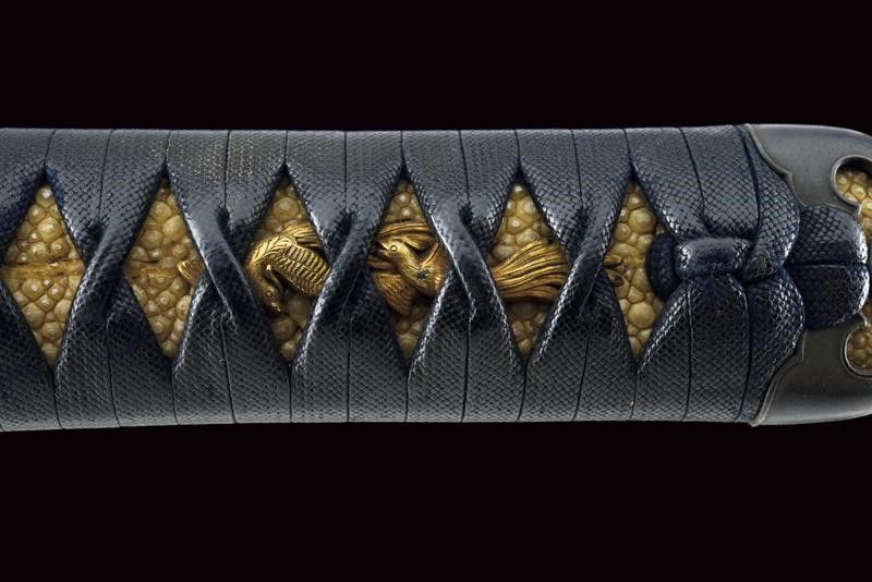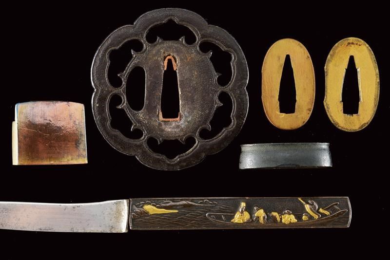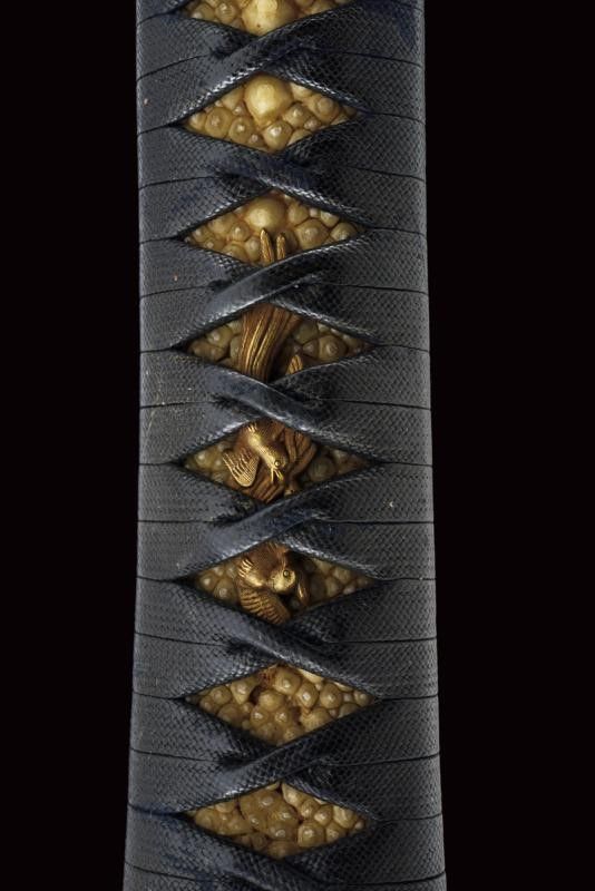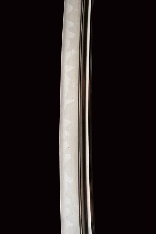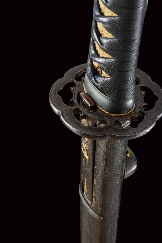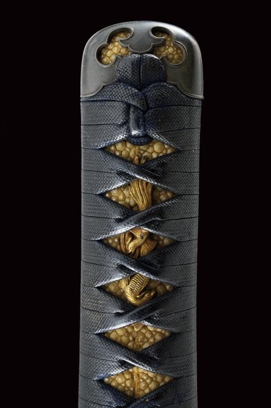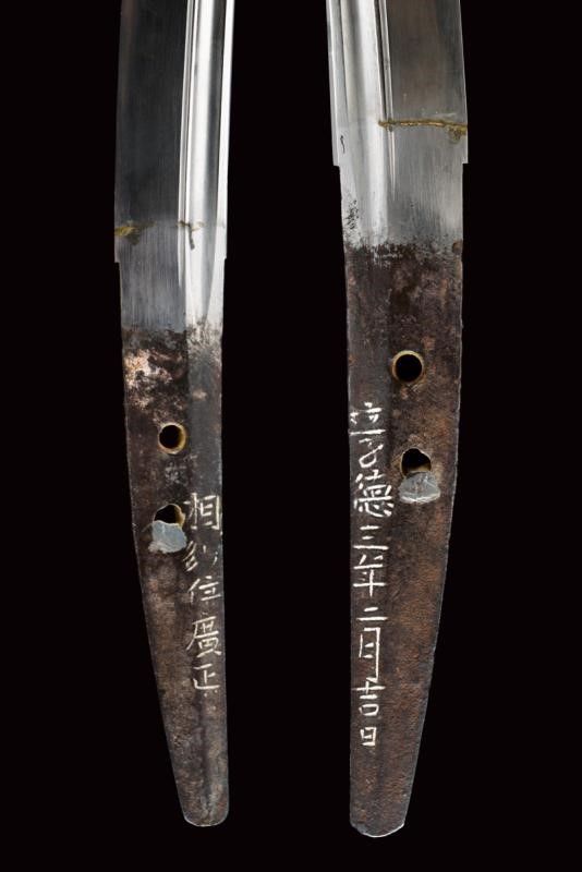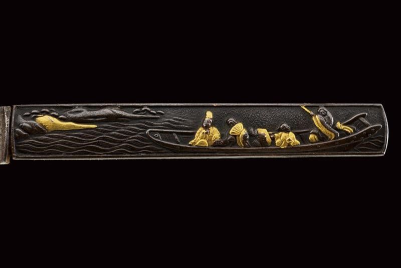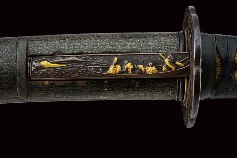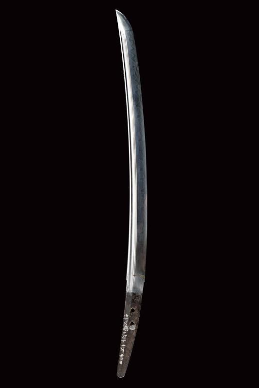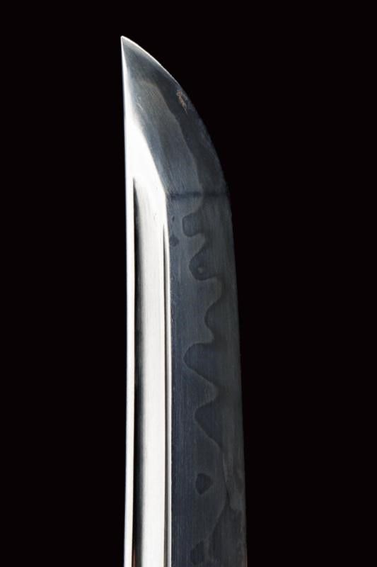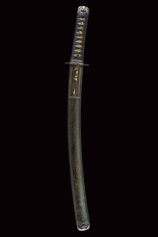 datazione: Periodo Edo (1603-1867) provenienza: Giappone, Shinogizukuri-iorimune. Nagasa (lung. 42.3 cm), hada: itame mokume, hamon: midare gunome togari tobiaki, boshi: ko maru notame, horimono: Bo-hi soebi, habaki in rame con resti di doratura. Nakago gimei: Soshu no ju Hiromasa Kyotoku ni nen Kitsujitsu (1459), due mekugi-ana. Koshirae con tsuba in ferro, kikka-gata, sukashi-bori, uchi-gaeshi-mimi. Fornimenti del tipo handachi. Tsuka in seta nera. Saya in legno laccata color verde scuro, la kozuka (lama marcata con un kanji) in rame, niko-bori in oro raffigurante una piccola barca con personaggi. Tardo periodo Edo. Interessante wakizashi con koshirae di qualità. lunghezza 61 cm.