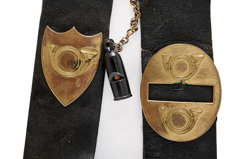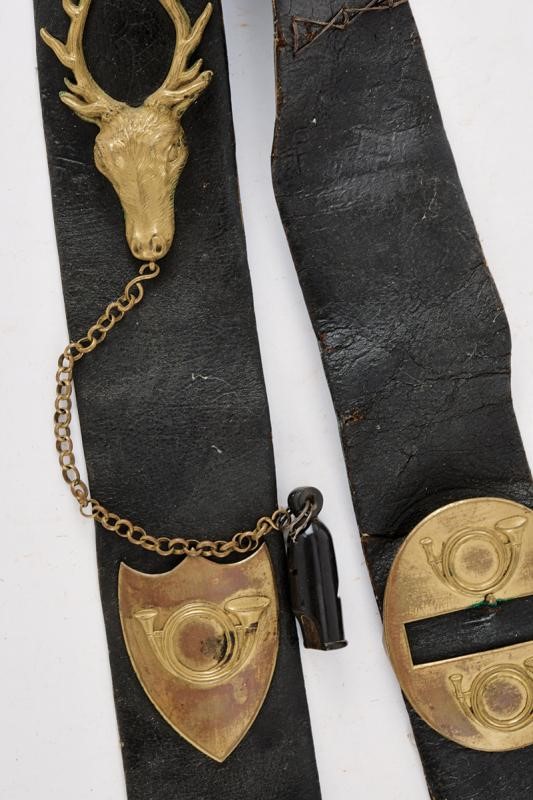 Fascia in spesso cuoio nero (una riparazione, piccoli danni, segni d'uso e del tempo) con fornimenti in ottone recanti effige in rilievo di un corno da caccia e resti di doratura antica, completa di fischietto in corno.