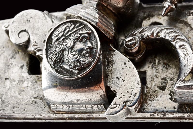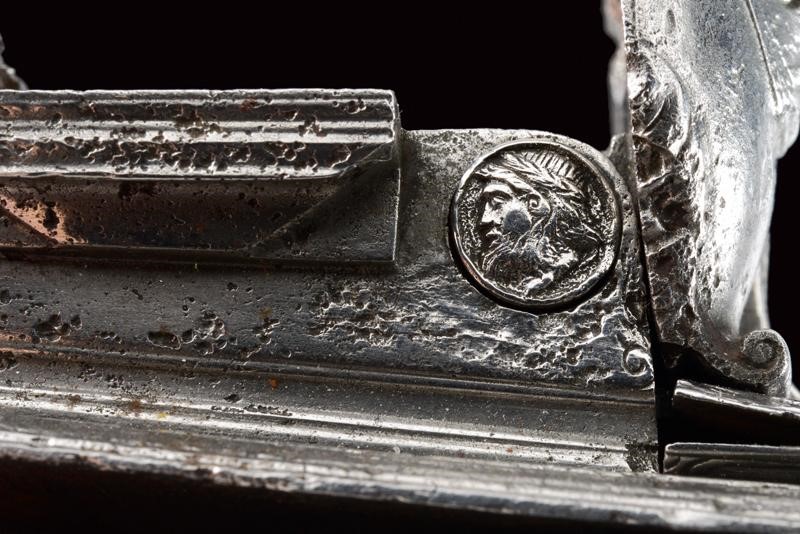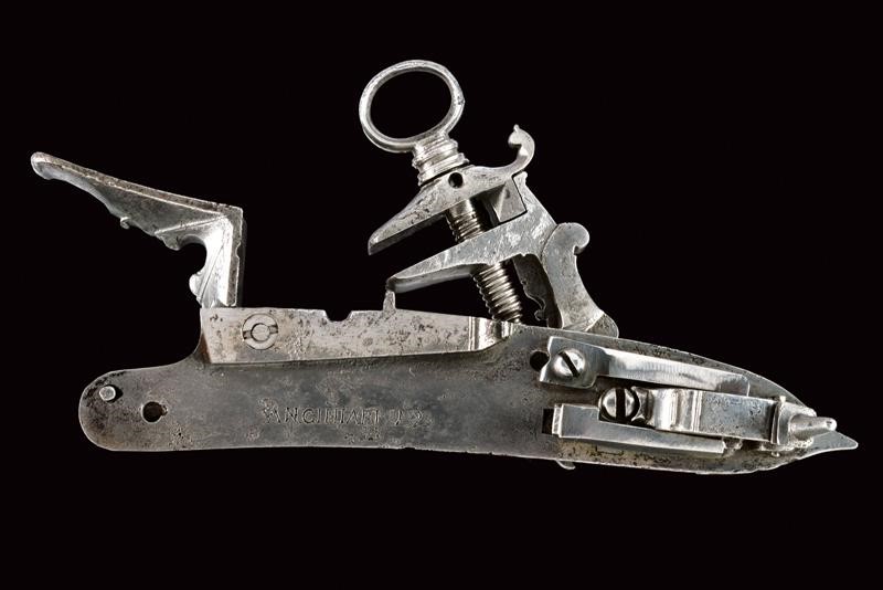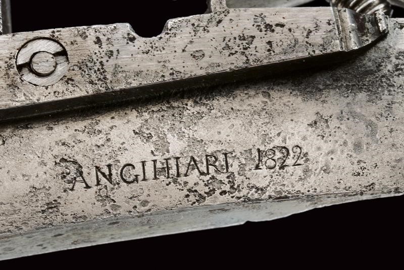Cartella piatta con marca di Domenico Guardiani rimessa in ottone (capovolta), il bordo ribassato, il cane intagliato, la vite coperta con un bel profilo di uomo barbuto. La vite della martellina con un altro piccolo volto intagliato. L'interno marcato "Anghiari 1822".
