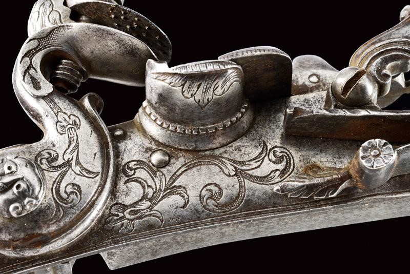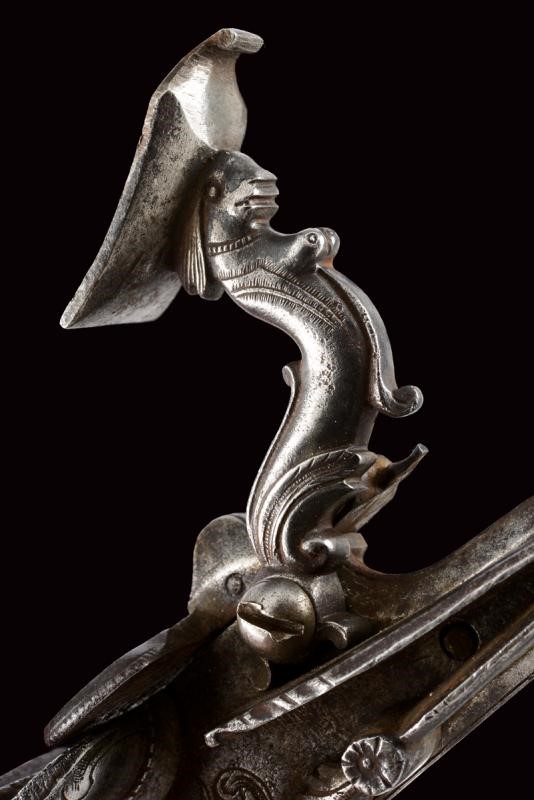 Cartelle tondeggianti, incise a motivi floreali al centro, le code intagliate con un bel mascherone in rilievo. I cani incisi a motivi floreali, le coperture delle viti con un mascherone intagliato. Belle martelline con una figura grottesca al collo. Copriscodellini scorrevoli.