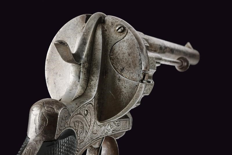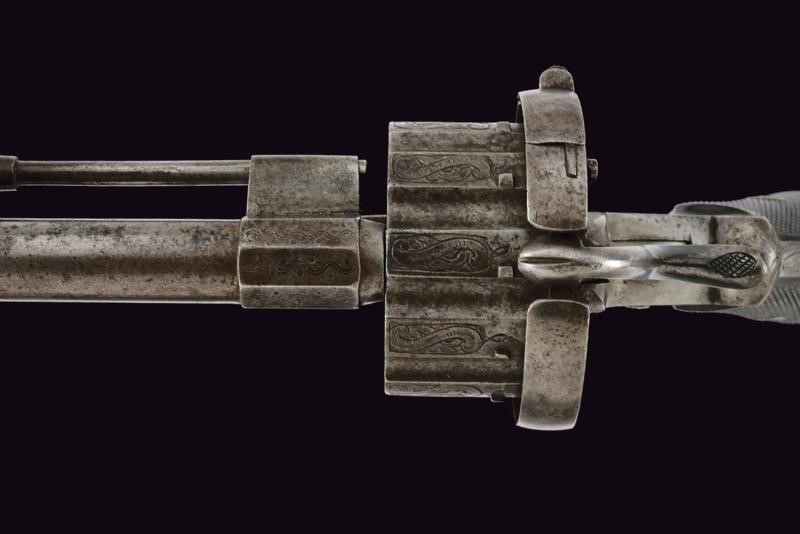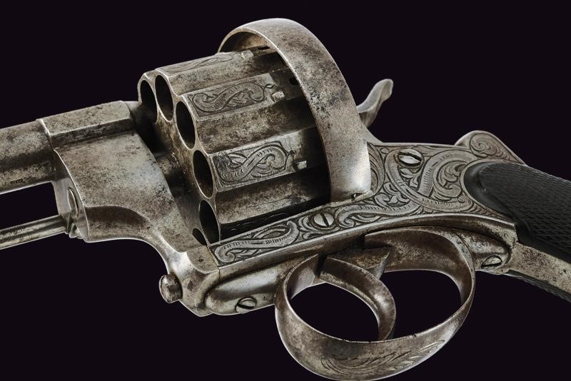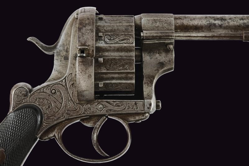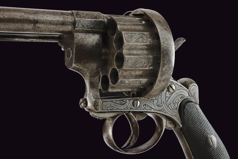 Canna tonda, rigata, con base ottagonale incisa, dotata di alto mirino, cal. 11 mm. Tamburo scanalato a dieci colpi ornato con incisioni floreali. Il castello decorato en suite e con matricola "225", il cane con restauro. Estrattore e sportellino di caricamento. Guancette in legno zigrinato, ponticello e cornice incisi. Anello di sospensione. Meccanica funzionante.