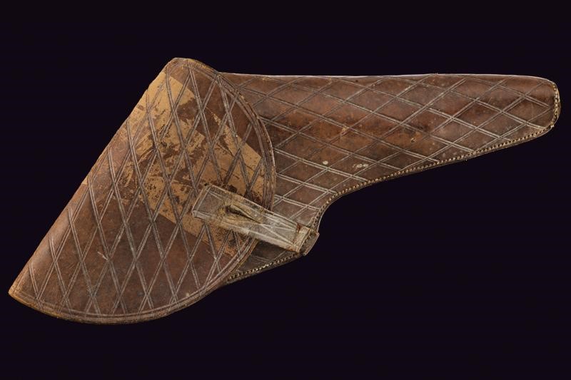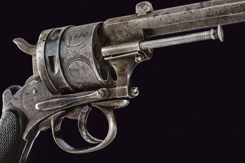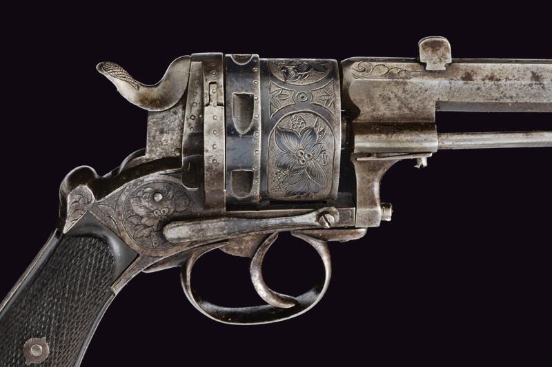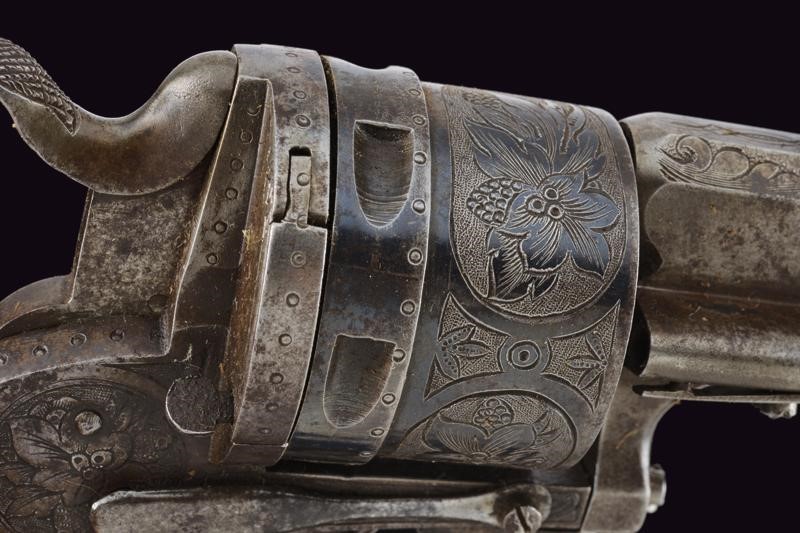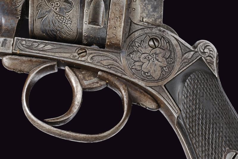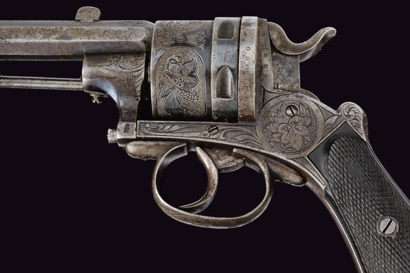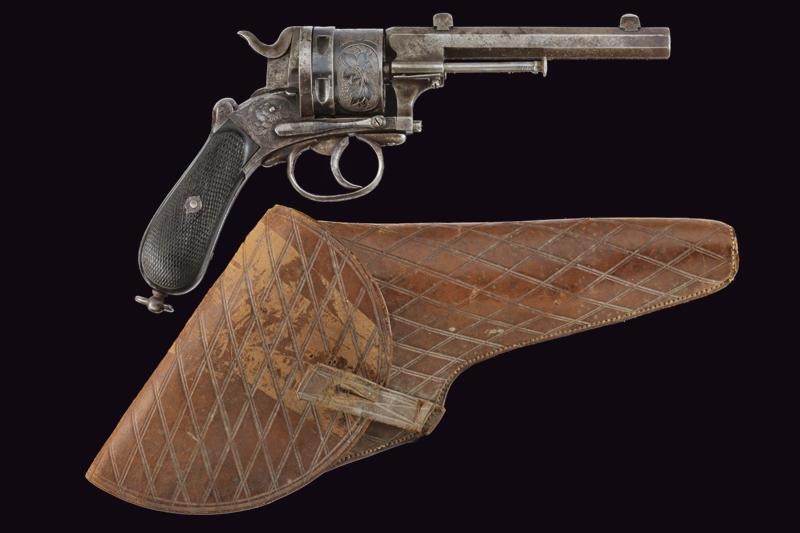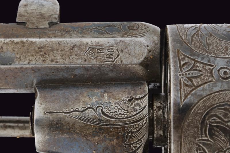 Canna ottagonale, rigata, con punzone "IF BC" sotto corona, alzo e mirino, cal 11 mm. Tamburo liscio a sei colpi finemente inciso e parzialmente brunito. Il castello inciso a motivi floreali. Estrattore e sportellino di caricamento. Meccanica funzionante ma la rotazione talvolta si ferma. Guancette in legno zigrinato. Anello di sospensione. In fondina di cuoio marrone (manca il bottone di chiusura).