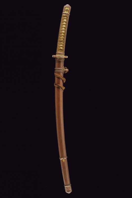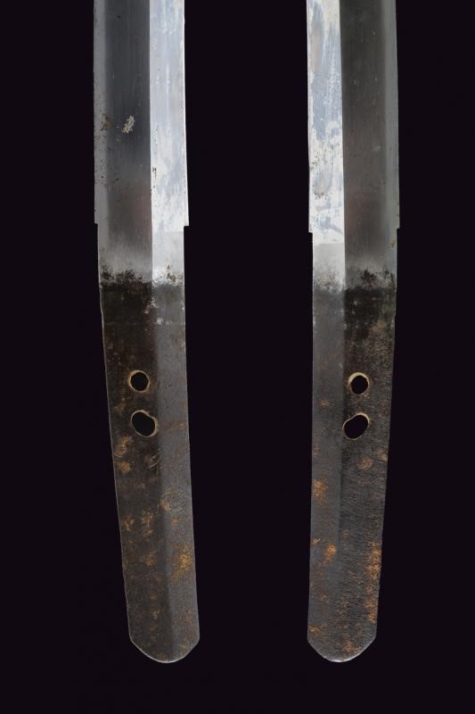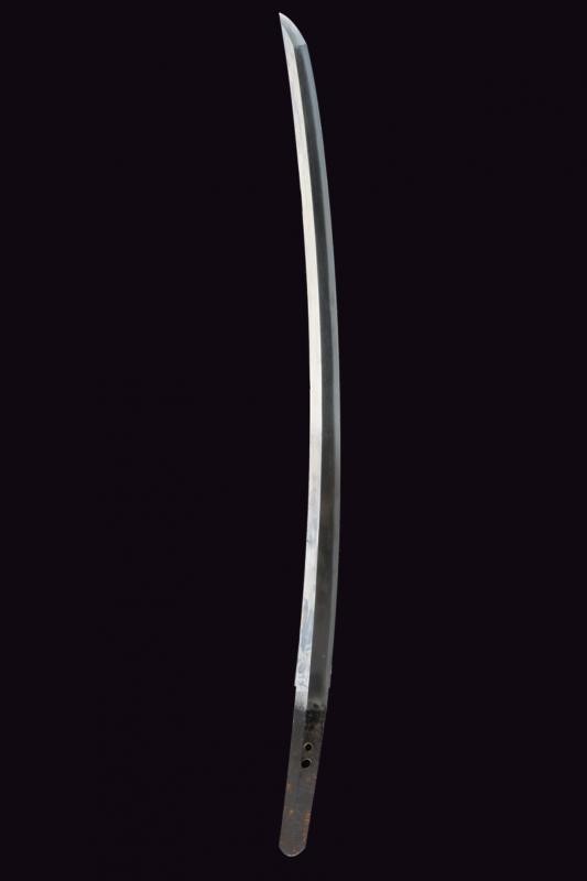Interessante lama del periodo Muromachi; nagasa (56.8 cm), hamon: chu suguha - utsuri; hada: itame; habaki in rame dorato. Nakako, porta la mei "Sukesada" con tre mekugi-ana, la firma aggiunta. L'eccezionale lama di epoca anteriore a questa firma. Tipica koshirae militare. Di buonissima qualità.
