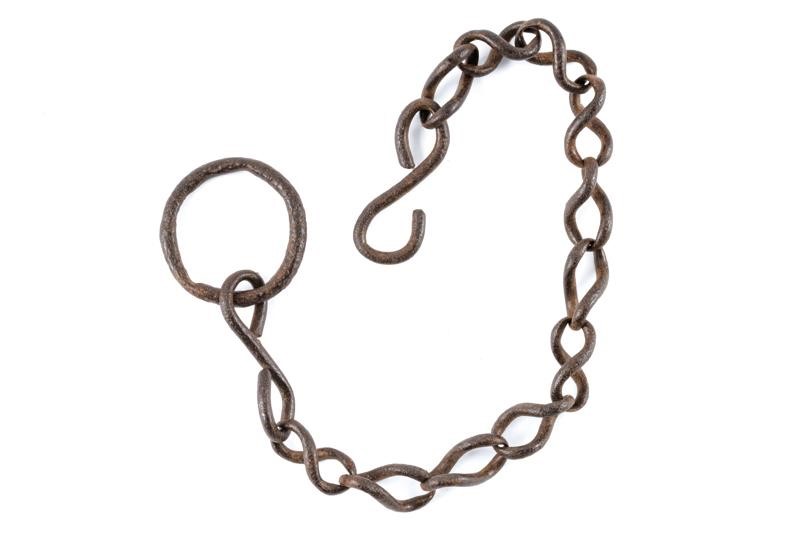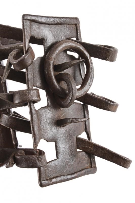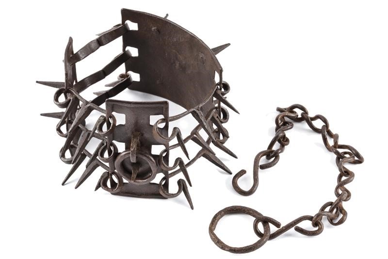 Composto da tre placche in ferro, cuspidate e unite da maglie in ferro, anche queste munite di punte. Una piastra provvista di spesso anello per il guinzaglio. In bella patina bruno-marrone. Insieme con un breve guinzaglio ben lavorato a cantena in maglie di ferro. Interessante.