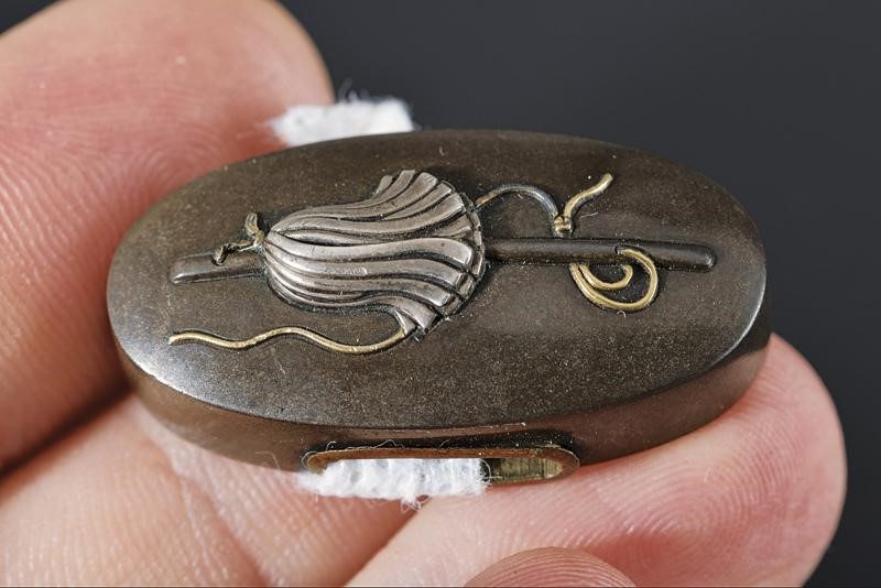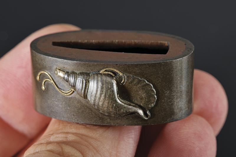 In shibuichi con decorazioni in argento ed oro. Yamabushi, tradizionale della scuola Nara. Il tema rappresenta gli strumenti tipici dei monaci guerrieri, la hora (grande conchiglia) e lo haraigushi (bastone per il rituale di purificazione). Di grande eleganza. In kiri-box.