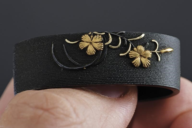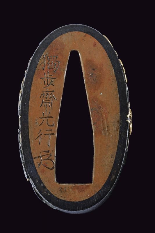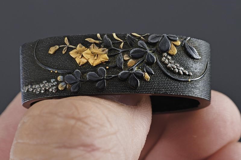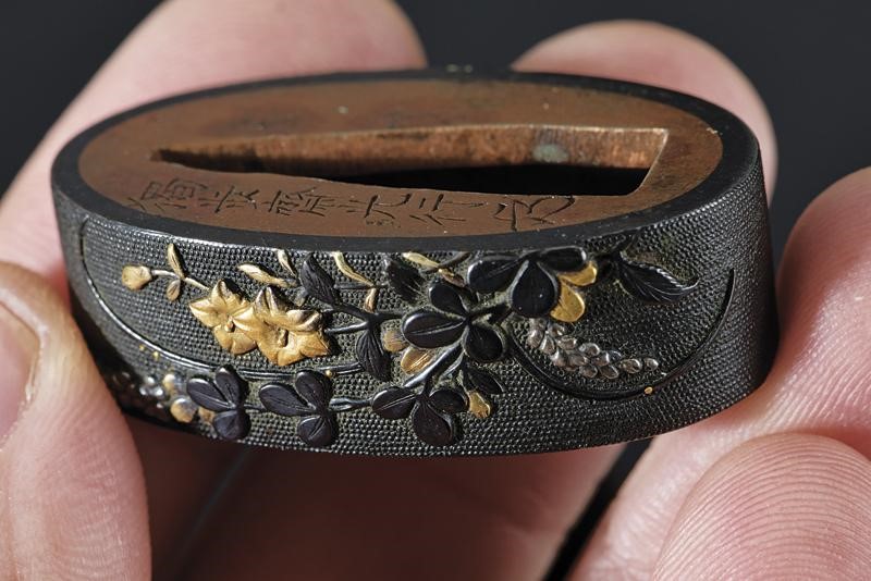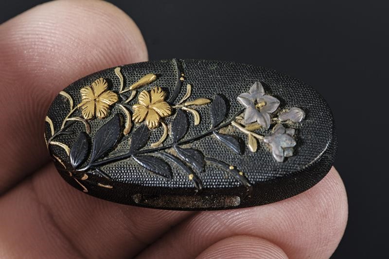 Scuola Kikuoka. In shakudo con dettagli in oro ed argento a tema floreale. Fuchi-mei Mitsuyuki, con Kao. Periodo Edo, 1750 circa. In kiri-box. Di buona qualità.