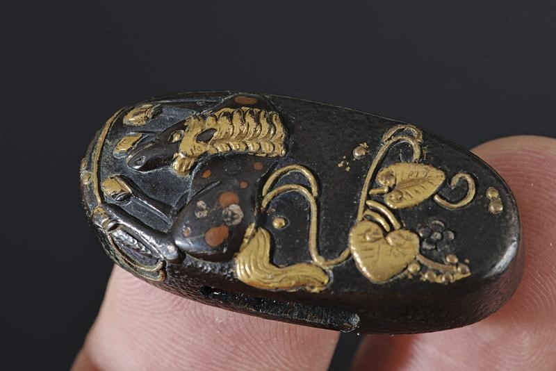 In shakudo con decorazioni in oro e shibuichi. Finemente decorati con un cavallo e foglie in rilievo. In antichità, il cavallo era venerato in Giappone come una divinità ed era un'anima essenziale nella vita quotidiana dei Samurai. La scuola Nara si è evoluta nel 1700 come una delle tradizioni più affermate nella produzione di kodogu. In kiri-box.