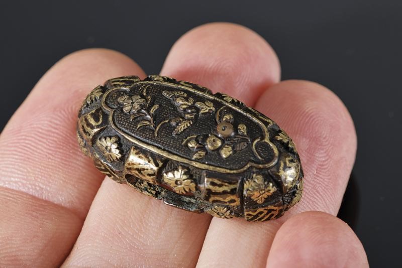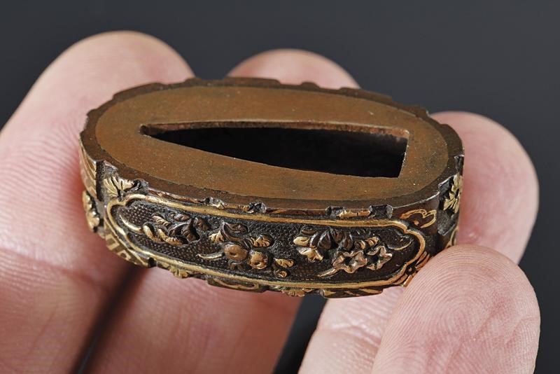 In shakudo, oro ed argento con finissime decorazioni floreali. Il tema rappresenta quello che si ritrova in alcuni templi scintoisti, con soffitti a cassettone decorati a motivi floreali circondati da simboli geometrici. Questa coppia devia dal tema ricorrente della scuola Goto mostrandone un'interpretazione originale. Periodo Edo, fine '700 - inizio '800. In kiri-box.