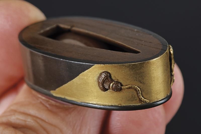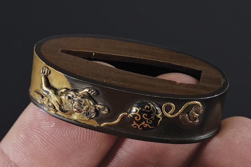 In shakudo e oro, koma inu attribuito a Mino Mitsunaka. Realizzato in due diverse porzioni distinte, oro e shakudo, il cane-leone guardiano dei templi shintoisti ed una sfera decorata in oro. Mitsunaka, vero nome Watanabe Shinkichi, era il secondo genero di Nitsutoki Nudai. Visse a cavallo fra le ere Bunsai e Meiji (1830-1889) e prediligeva motivi di carattere floreale e animale. In kiri-box.