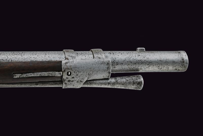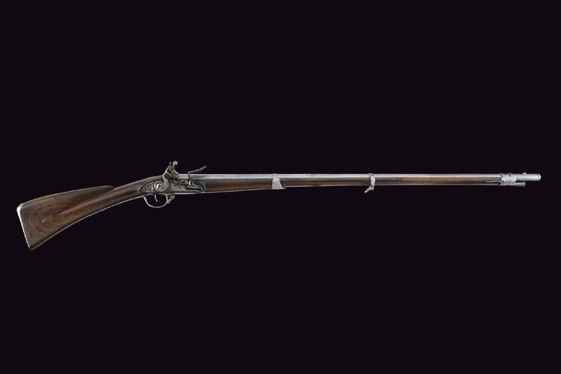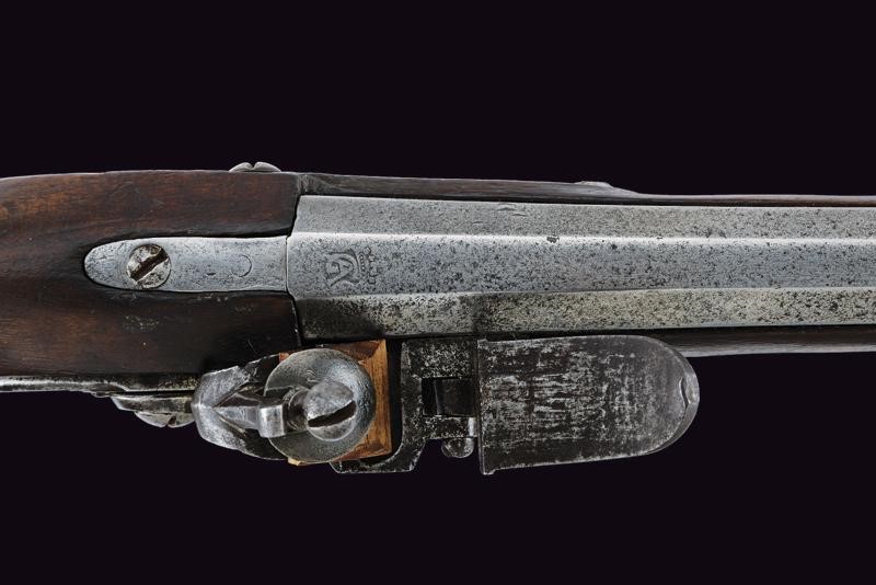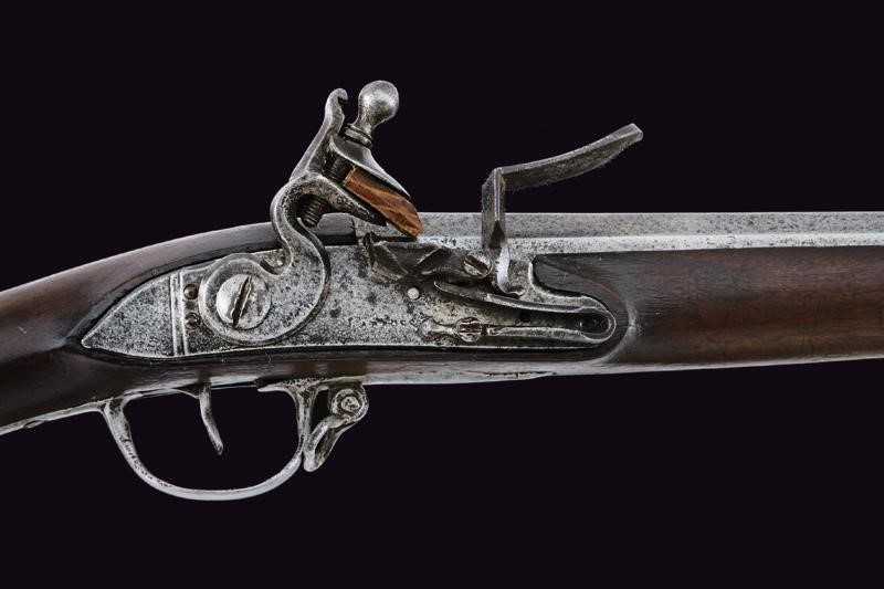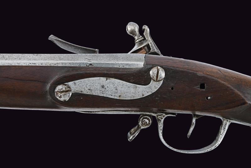 Canna liscia (anima pulita, pitting) a due ordini, prima ottagonale con bella marca "GA" sotto corona, poi tonda, con anellatura al cambio e munita di mirino che funge anche da attacco per la baionetta, cal. 18 mm. Batteria a pietra focaia completamente in ferro, con resti di firma. Cassa intera in legno (piccolo restauro) con timbro piemontese e "CL" sulla guancia destra. Fornimenti in ferro, bocchino con marcature "No" e "A.D." Bacchetta in ferro. Raro.