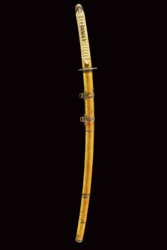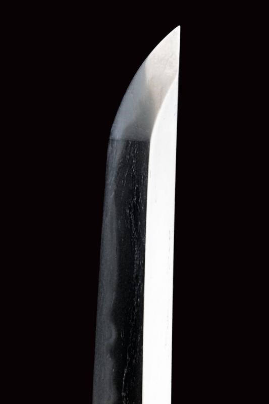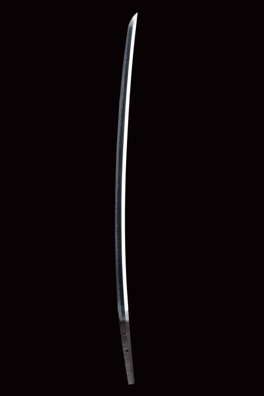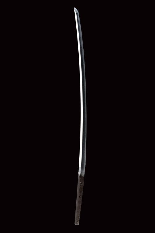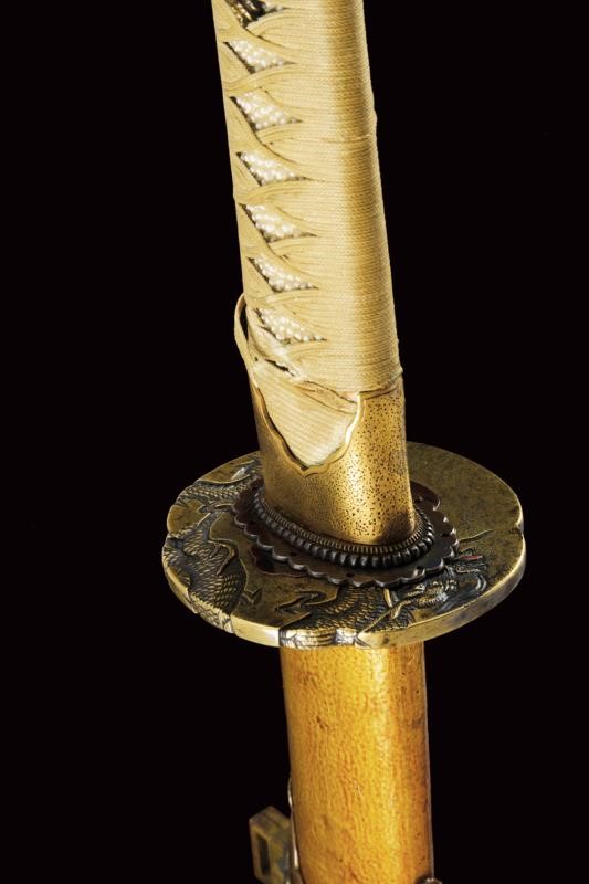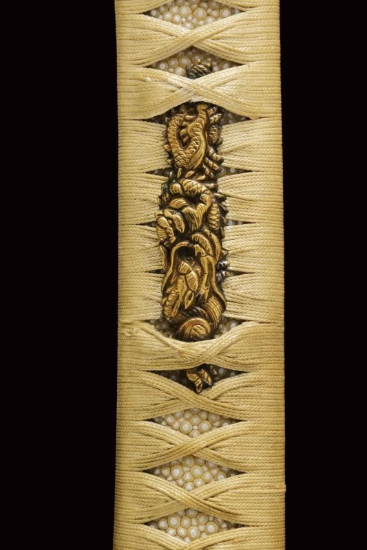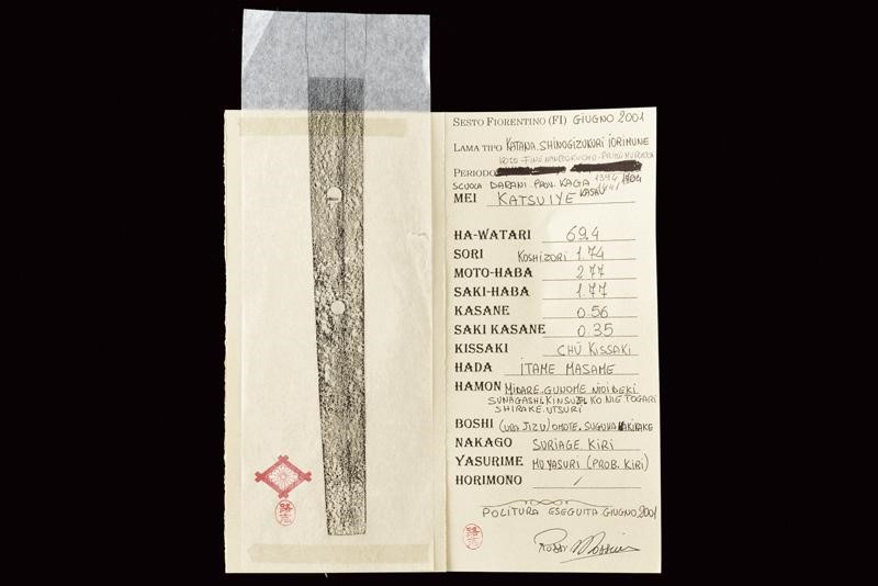 Lama Shinogizukuri Iorimune (nagasa lung. 69,4 cm), hada: Itame Masame; hamon: Midare Gunome Nioi Deki Sunagashi Kinsuji ko Nie Togari Shirake Utsuri; Kissaki: Chu Kissaki; Boshi: (Ura Jizu) Omote Suguha Hakikake. Habaki in rame dorato. Nakago mei: "Katsuiye", Suriage Kiri; Yasurime: Muyasuri. Due mekugi-ana. Scuola Darani Provincia Kaga. Fine Nanbokucho - Primo Muromachi (1394-1441). Koshirae Tachi (fine XVIII - inizio XIX secolo) con importante Mokko Tsuba mei: Hirado ju Kunishige e con Kao, finemente incisa con un drago, lunghi menuki raffiguranti un drago, tutti fornimenti en suite. Tsuka con jabara-ito in seta bianca. Bella saya laccata in oro. Con scheda tecnica.