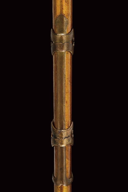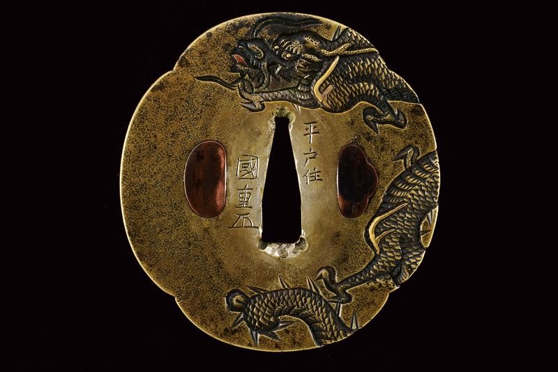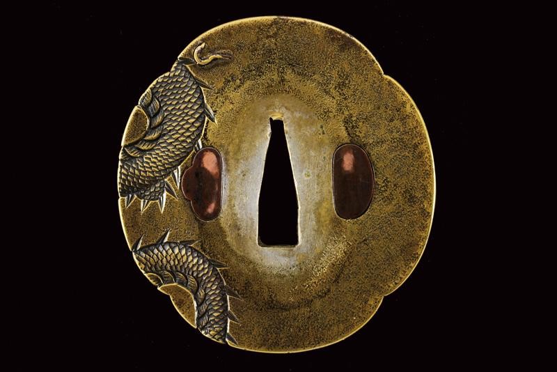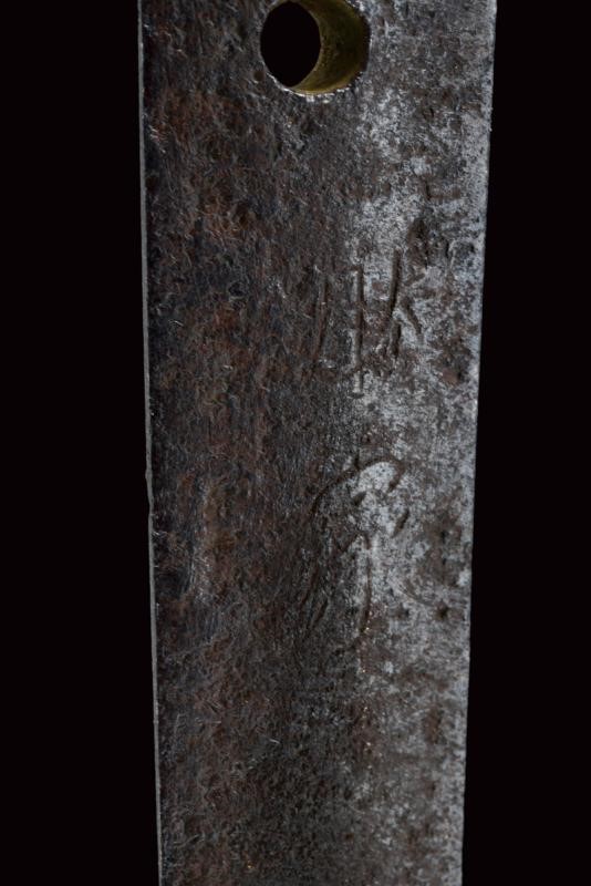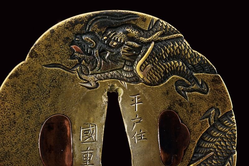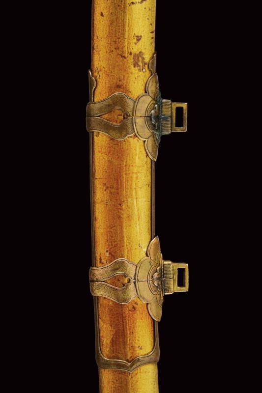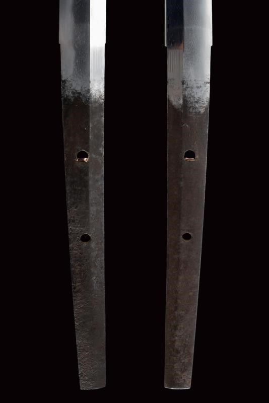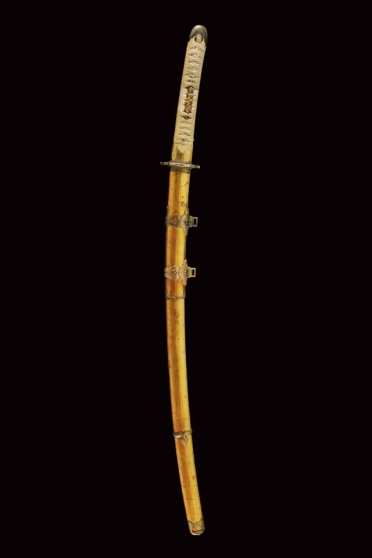 Lama Shinogizukuri Iorimune (nagasa lung. 69,4 cm), hada: Itame Masame; hamon: Midare Gunome Nioi Deki Sunagashi Kinsuji ko Nie Togari Shirake Utsuri; Kissaki: Chu Kissaki; Boshi: (Ura Jizu) Omote Suguha Hakikake. Habaki in rame dorato. Nakago mei: "Katsuiye", Suriage Kiri; Yasurime: Muyasuri. Due mekugi-ana. Scuola Darani Provincia Kaga. Fine Nanbokucho - Primo Muromachi (1394-1441). Koshirae Tachi (fine XVIII - inizio XIX secolo) con importante Mokko Tsuba mei: Hirado ju Kunishige e con Kao, finemente incisa con un drago, lunghi menuki raffiguranti un drago, tutti fornimenti en suite. Tsuka con jabara-ito in seta bianca. Bella saya laccata in oro. Con scheda tecnica.