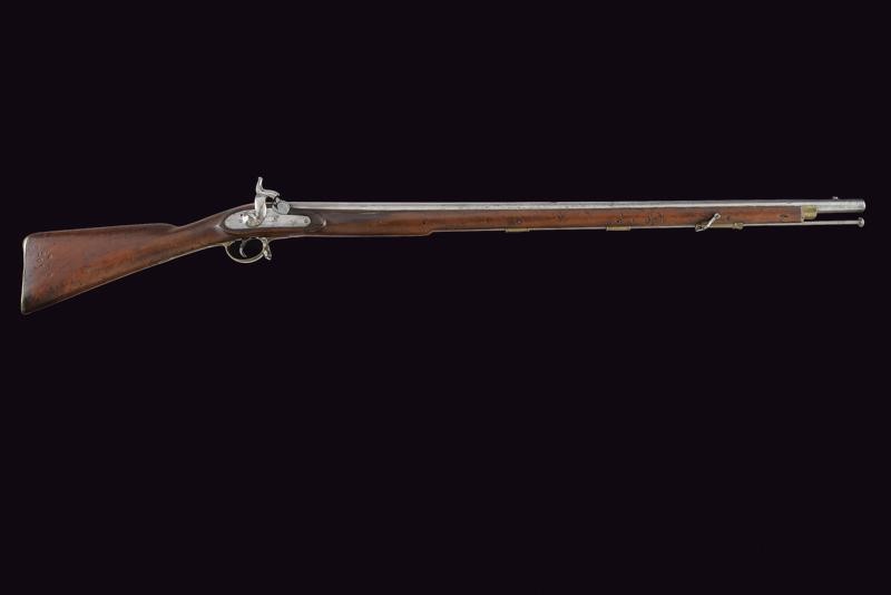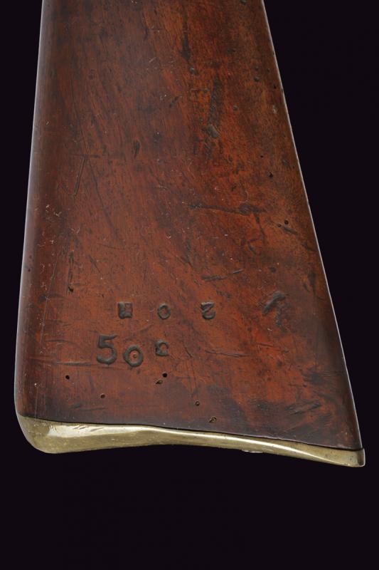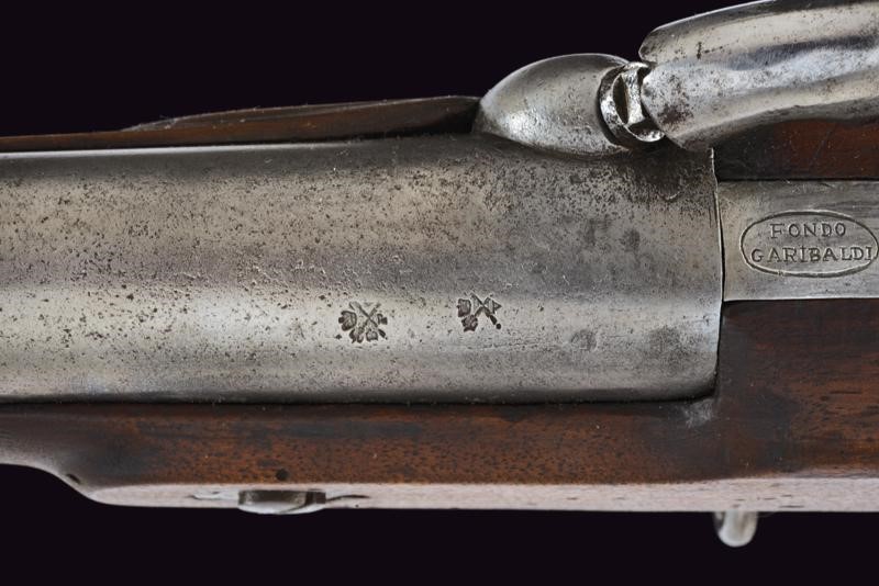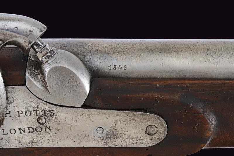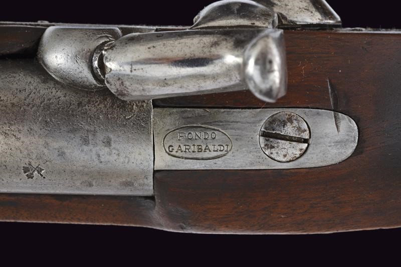 Canna tonda, liscia, con due punzoni del banco di prova alla base e data "1848", attacco per la baionetta che funge anche da mirino, cal. 18 mm; codetta marcata "FONDO GARIBALDI". Batteria a molla in avanti con cartella piatta marcata "H. POTTS LONDON"; cassa intera in legno (piccoli restauri e fori di tarlo) con qualche timbro sulla guancia destra e fornimenti in ottone.