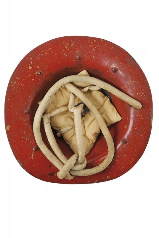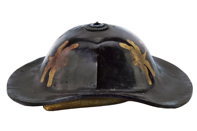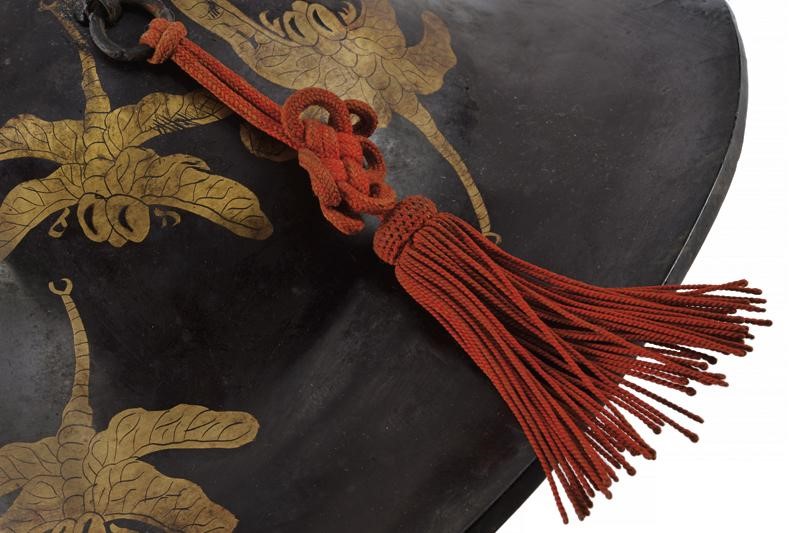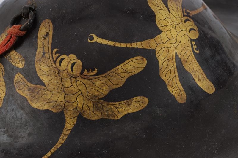 Leggera struttura in kanshitsu, l'esterno laccato bruno liscio (piccole mancanze, segni del tempo e qualche restauro alla finitura) con belle effigi dorate di libellule. In alto il tehen-kanamono in metallo color argento. Il lato inferiore in lacca rossa screziata oro. Con futon e allacci in seta. Una fila di passanti metallici alla base della tesa.