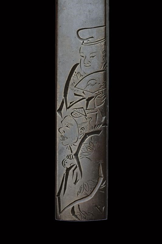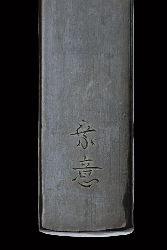 In shibuichi, con decorazione a cesello raffigurante un saggio con il suo studente. Scuola Nara. Joi realizzava le suo opere prediligendo lo shibuichi ed esibendo una perfetta tecnica di incisione. Sugiura Joi è uno dei tre grandi di Nara assieme a Nara Toshinaga, del quale fu allievo. Mei: "Joi". Periodo Edo, XVIII secolo. In kiri-box.