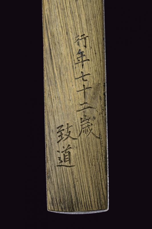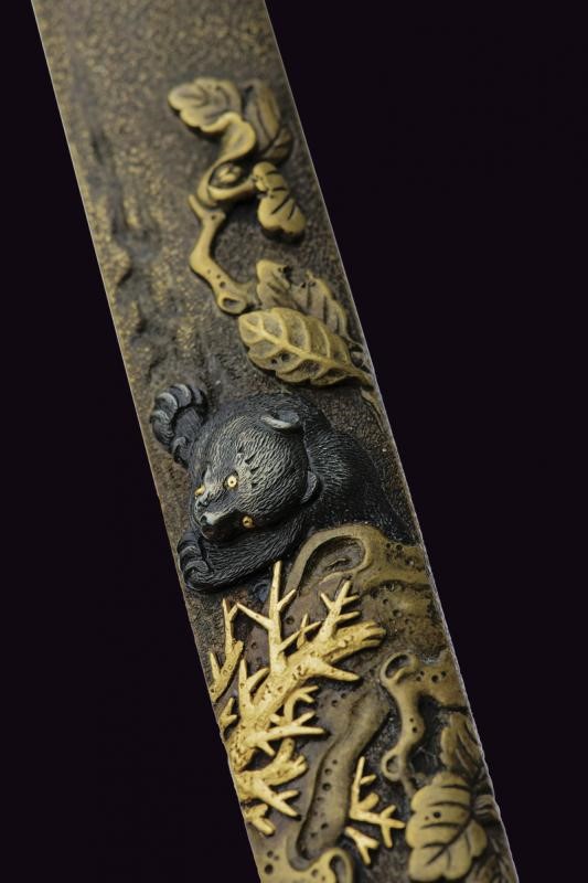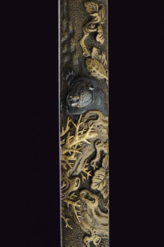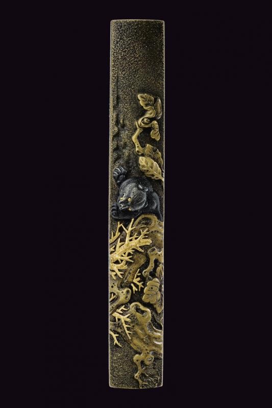 In sentoku, shakudo, shibuichi ed oro, firmata "Munemichi". Forgiata in sentoku, questa kozuka raffigura una pantera (in shakudo) in agguato nella foresta; i dettagli sono realizzati in shibuichi ed oro. Bellissima scena di grande qualità. Periodo Edo, fine '700 - inizio '800. In kiri-box.