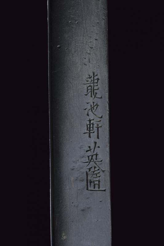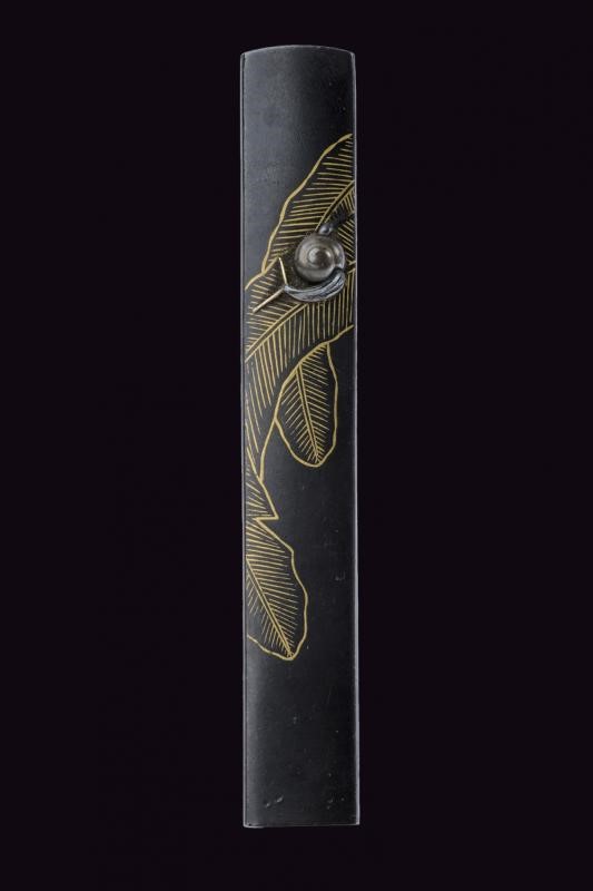 In shakudo, con effige in bassorilievo in argento di una chiocciola su una foglia, questa realizzata in oro. Mei: "Ryuchiken Teruyuki". I suoi lavori sono eleganti e riescono a combinare differenti stili mantenendone l'armonia. Sono pochi i suoi lavori giunti sino ad oggi. Scuola Satsuma. Periodo Edo, 1800 circa. In kiri-box.