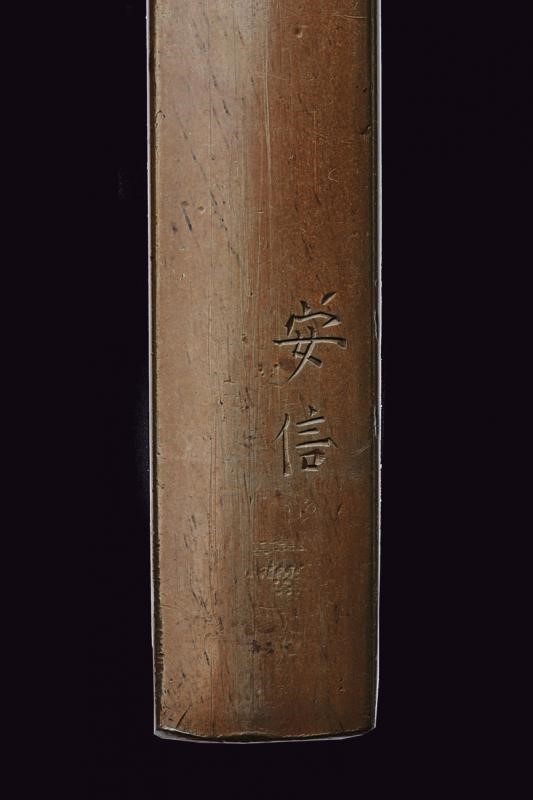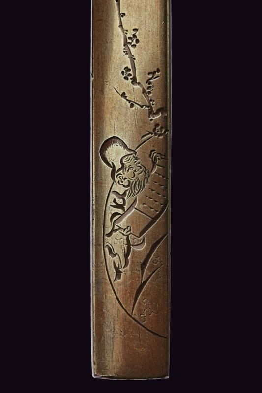 In shakudo, con effige di un saggio immerso nella lettura di una pergamena, all'ombra di un ciliegio in fiore, i capelli argentati. Mei: Yasunobu Nidai, nella tradizione omonima. In kiri-box.