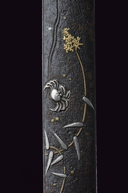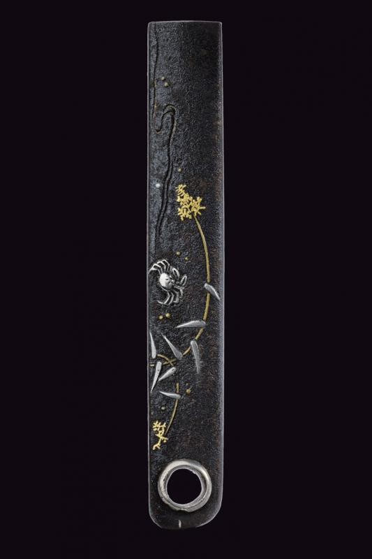 In ferro con decorazioni in argento e oro. Tipico esempio della scuola Higo, con effige di un granchio in argento sulla spiaggia con decorazioni floreali in argento ed oro. Questa kozuka rappresenta uno dei maggiori esempi di finezza e delicatezza della scuola Higo. Periodo Edo, 1800 circa. In kiri-box.