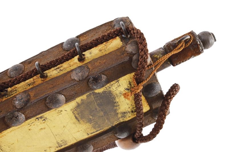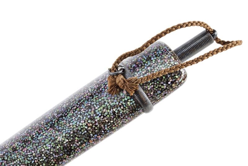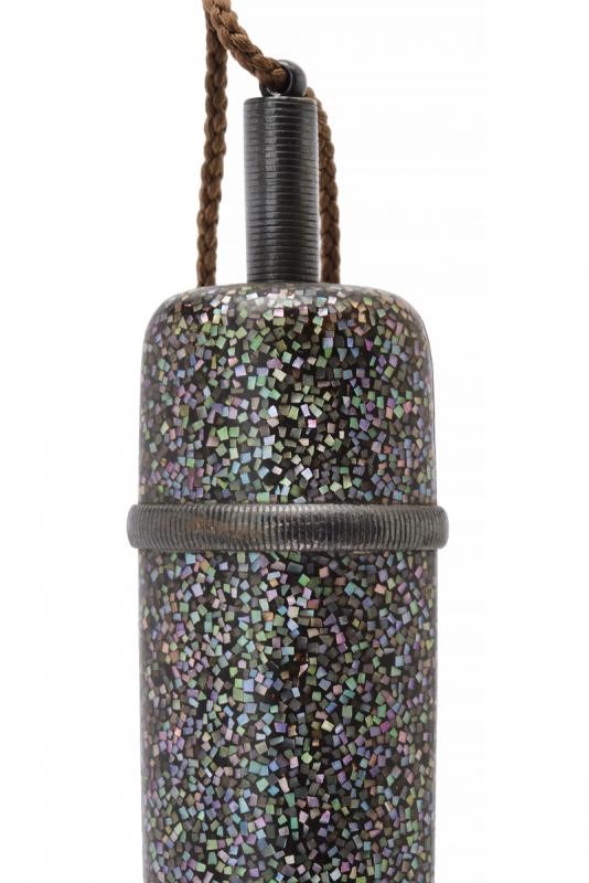 Una con corpo di forma allungata finemente rivestito con lacca mescolata a frammenti in madreperla. Una con corpo a parellelepipedo in legno, parzialmente dorato e con fornimenti in legno e metallo.