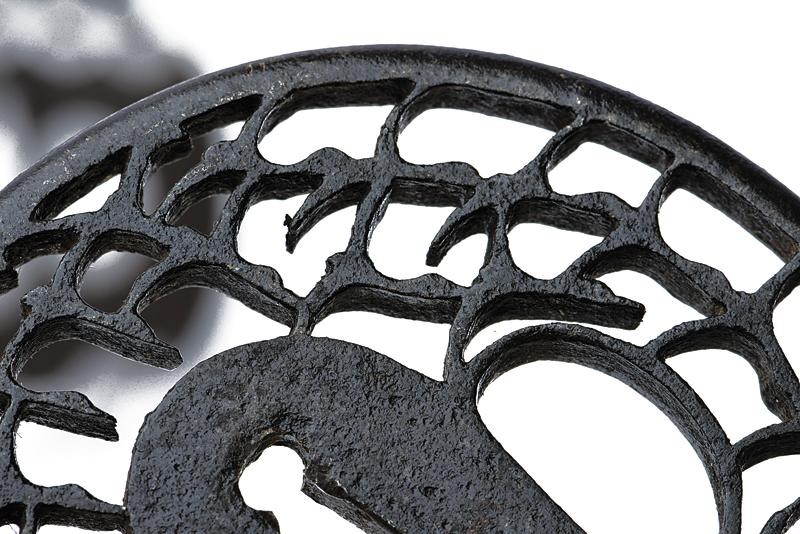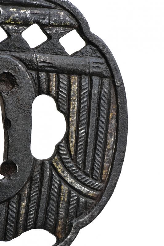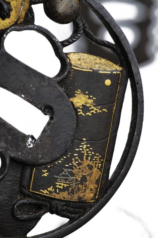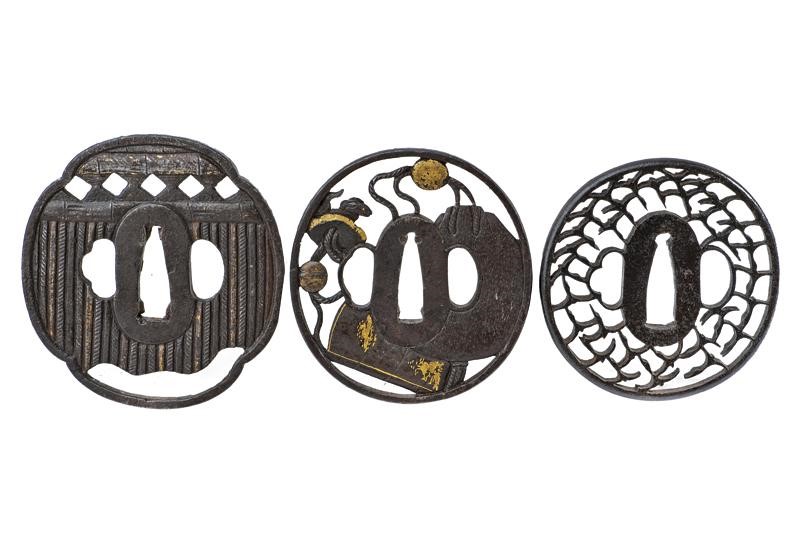 Una in ferro, tate-maru-gata, sukashi, kozuka e kogai-hitsu-ana. Ko-maru-mimi. Una in ferro mokko-gata, intagli a forma di bambù, sukashi, resti di doratura, kaku-mimi, kozuka e kogai-hitsu-ana. L'ultima del XX secolo in ferro tate-maru-gata, sukashi con utensili e cane con resti di doratura, kozuka e kogai-hitsu-ana. Tutte in kiri-box.