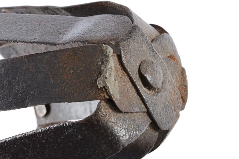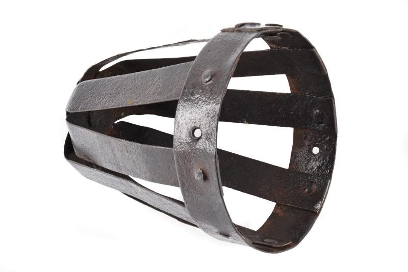 Realizzata con bande di ferro congiunte sul lato anteriore e tenute da una doga sul retro. Due ribattini di restauro e due doghe con piccola riparazione. In patina bruna.